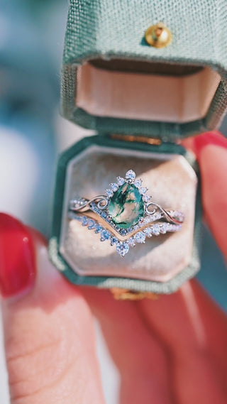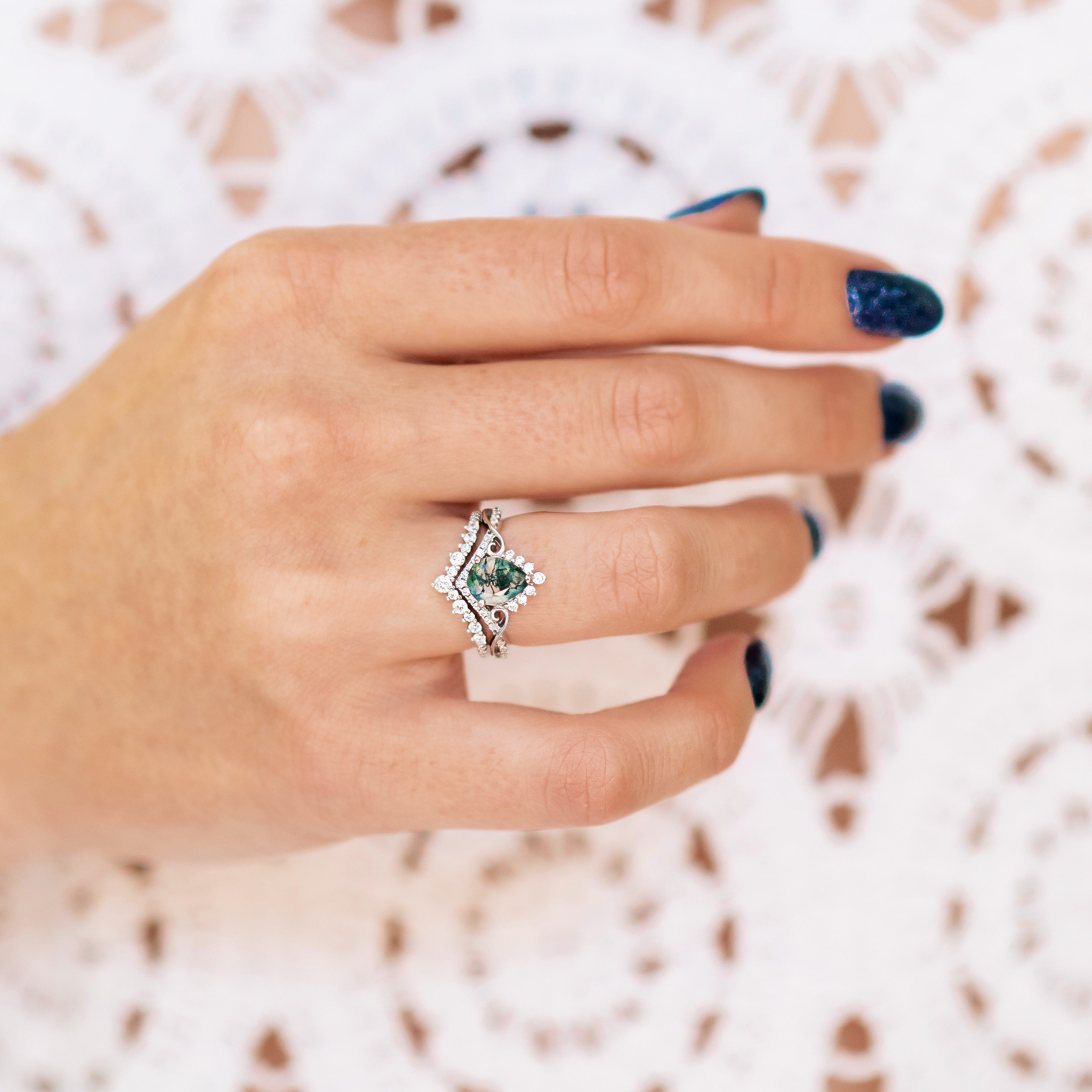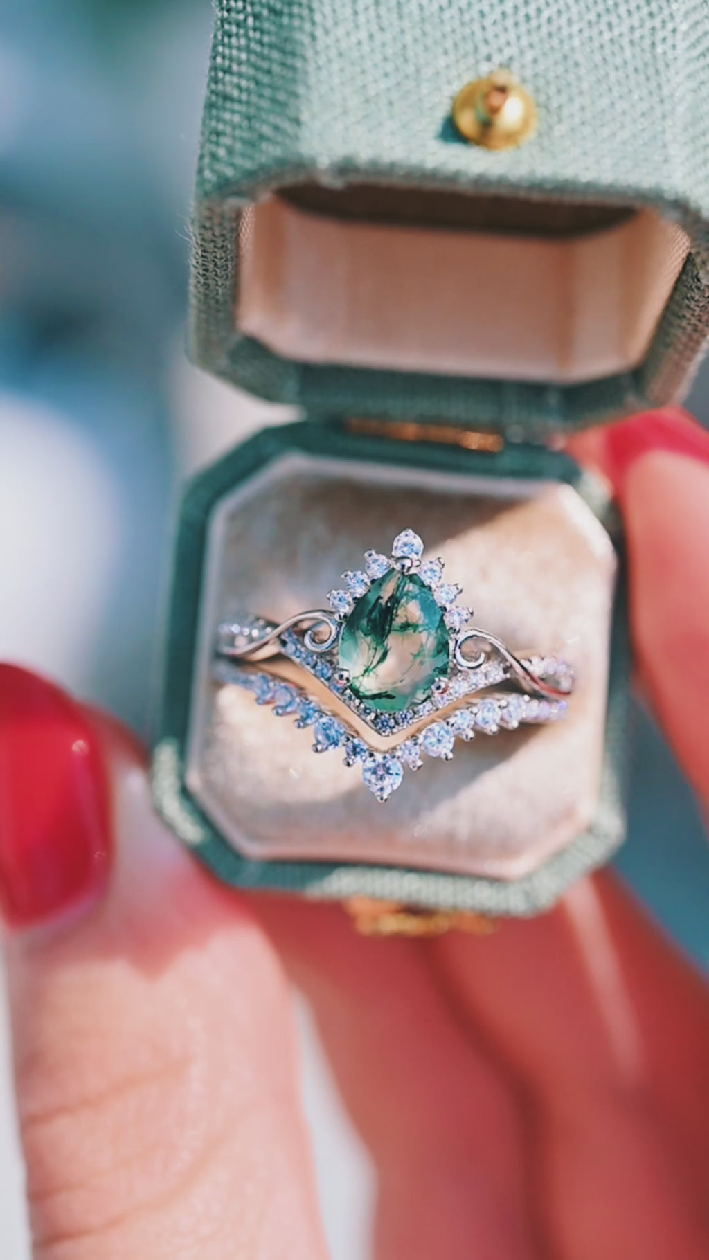 The Moss Agate Twirl & Hammered Tungsten Set draws inspiration from the tranquility of nature and the way love grows in harmony over time. Her teardrop moss agate—each stone naturally one-of-a-kind—reflects the beauty of forests, earth, and renewal, encased in a flowing twirl silhouette that symbolizes movement and connection. His hammered tungsten band echoes rugged landscapes, while the crushed moss agate inlay ties their designs together through shared color, depth, and meaning. Together, they form a grounded yet elegant pairing—one vibrant, one bold, both beautifully intertwined.