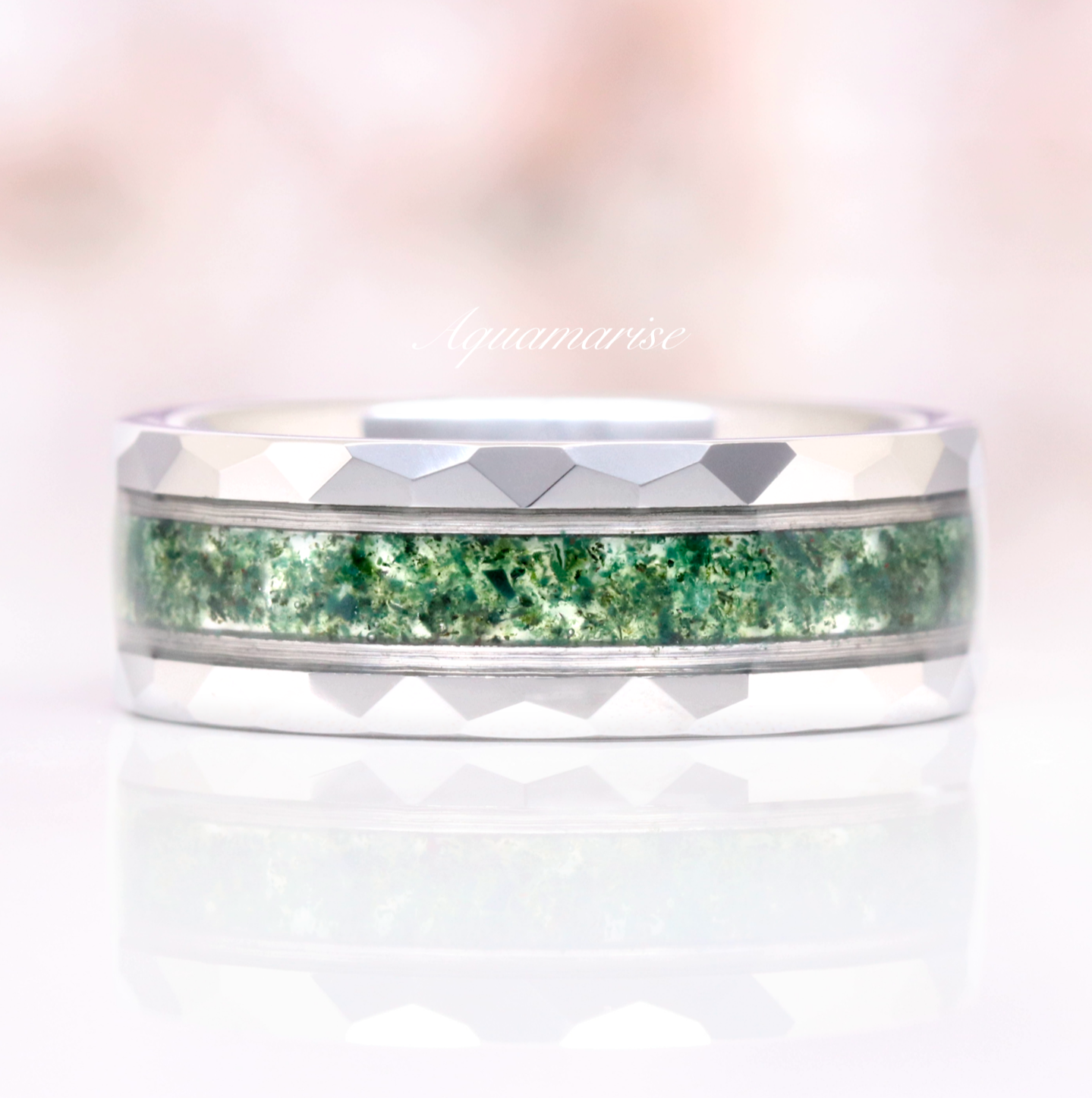 ► Men’s Ring Style: 8mm polished hammered tungsten band with crushed moss agate inlay