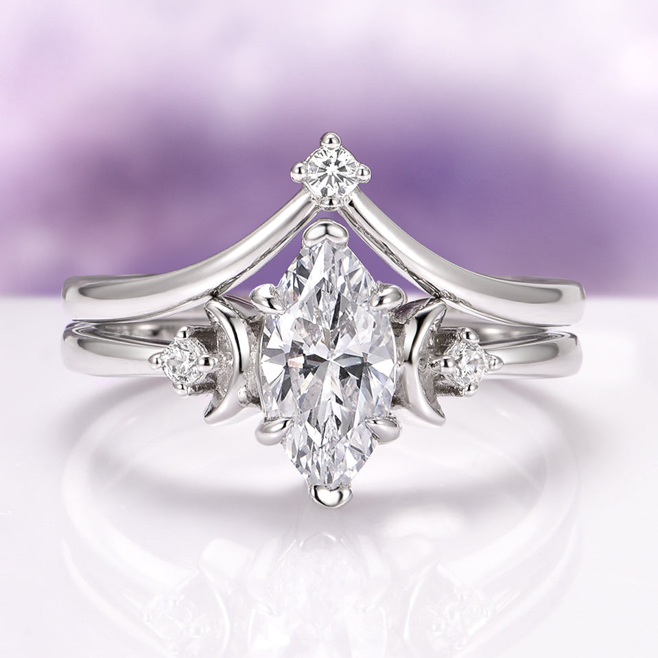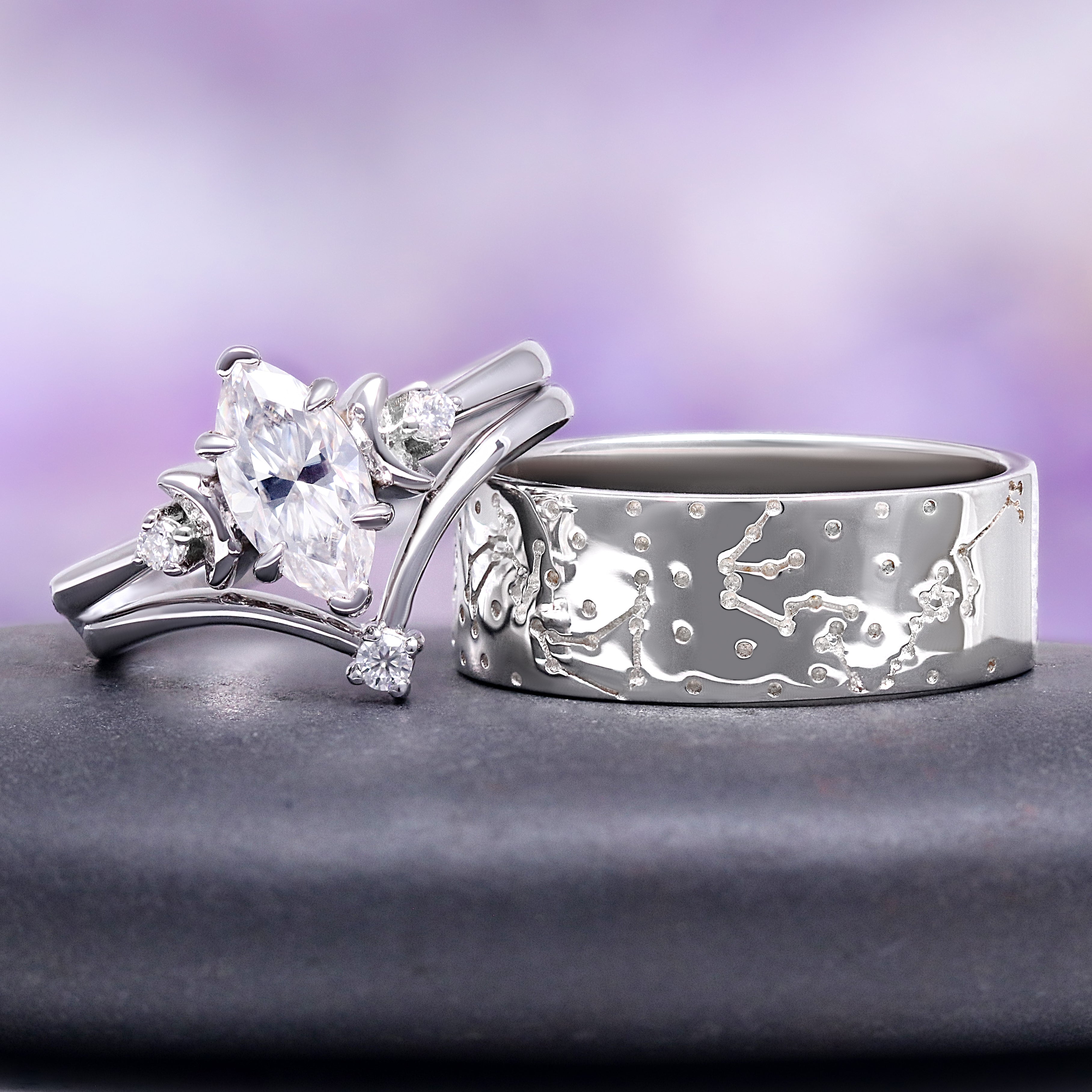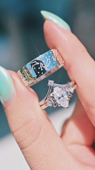 The Marquise Moissanite Moon and Constellation Ring Set is inspired by the magic of the night sky and the quiet pull of lunar light. Her marquise moissanite, surrounded by celestial crescent accents, mirrors the brilliance of a falling star. His constellation band traces a subtle star map across the polished surface, representing shared paths and intertwined destinies. Together, they form a modern celestial harmony—one radiant, one grounded, both beautifully aligned.