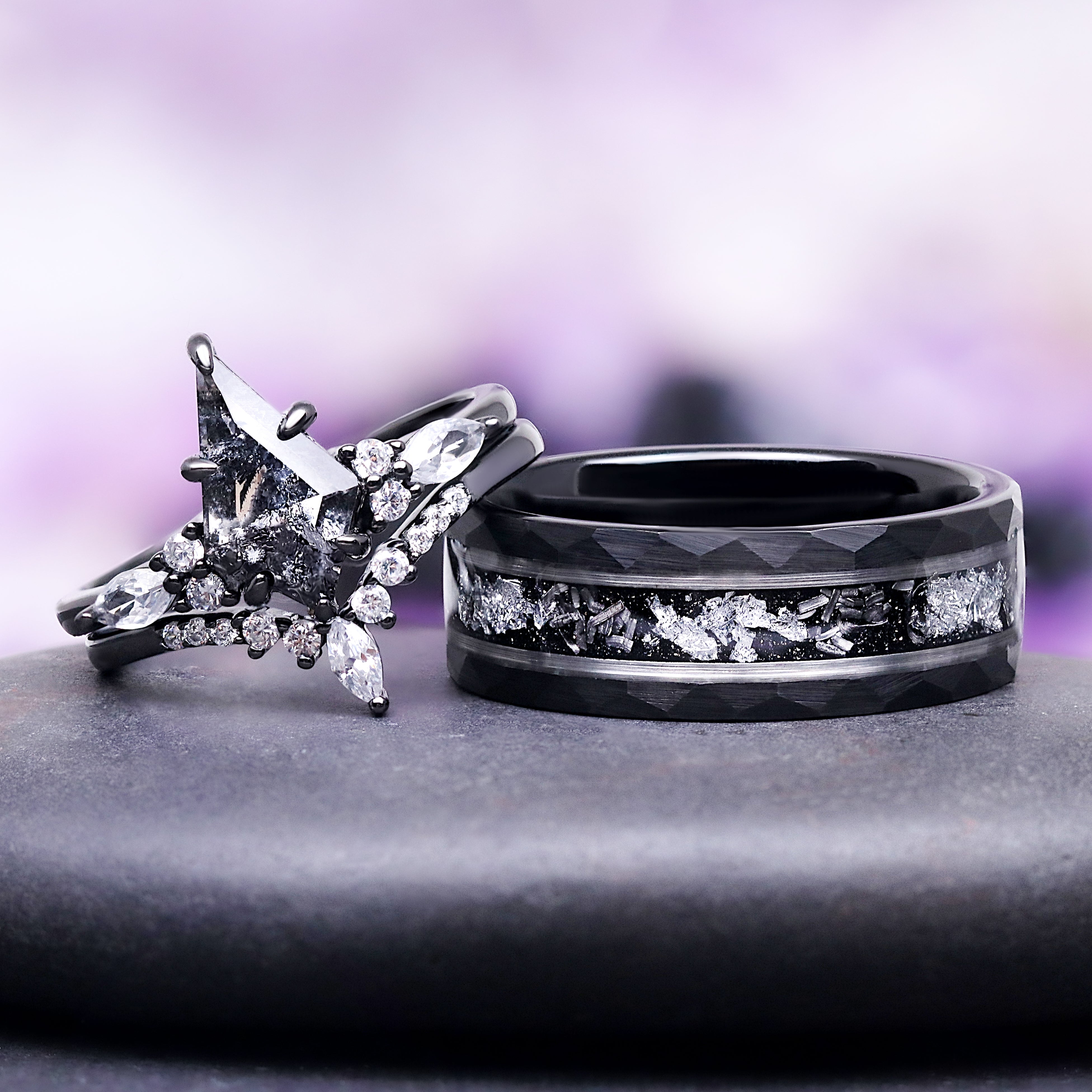 ► His Ring: Expertly crafted from tungsten carbide, his 8mm two-tone band showcases a rugged brushed black hammered finish complemented by a sleek silver-tone edge. The inlay features genuine meteorite fragments mixed with silver leaf — a symbol of a love that’s strong, rare, and infinite.