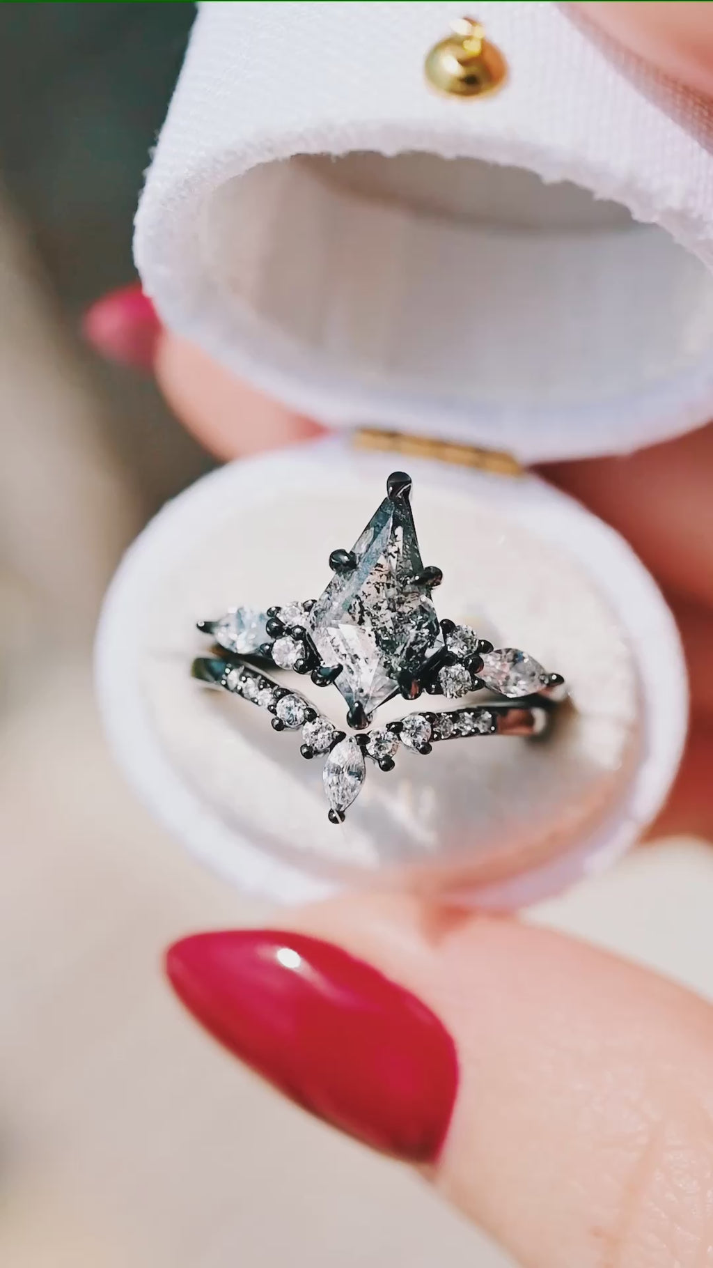 ► Her Ring: From our signature Skye Kite® collection, her engagement ring is handcrafted in solid 925 sterling silver with a black ruthenium finish, creating a mesmerizing dark luster reminiscent of the night sky. It features a 6x12mm (approx. 1.7 ct) natural Herkimer diamond in a distinctive kite cut, surrounded by shimmering cubic zirconia accents that sparkle like distant constellations.