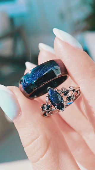 Together, these elements create a galaxy-inspired couples ring set that balances light and dark, elegance and strength, magic and meaning.