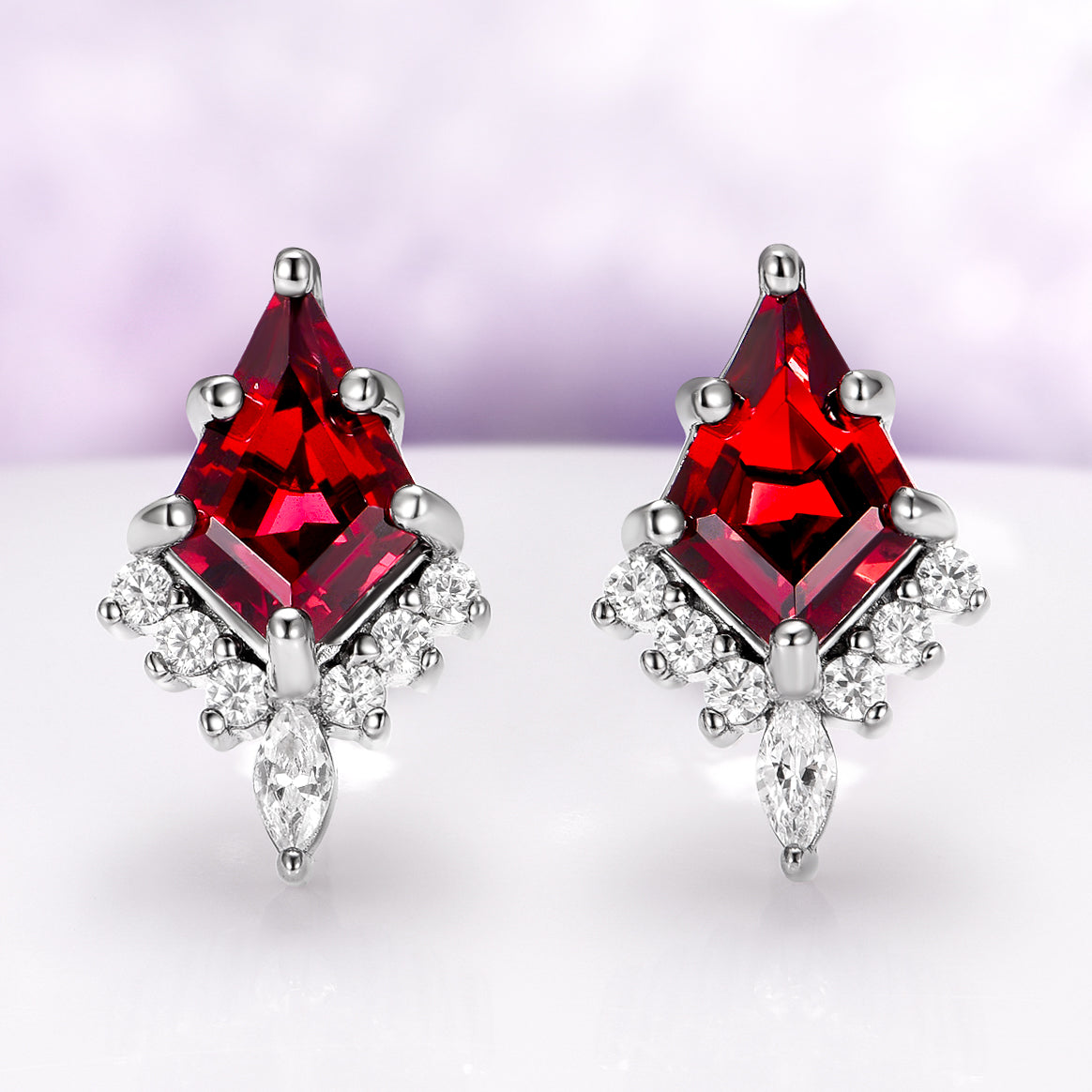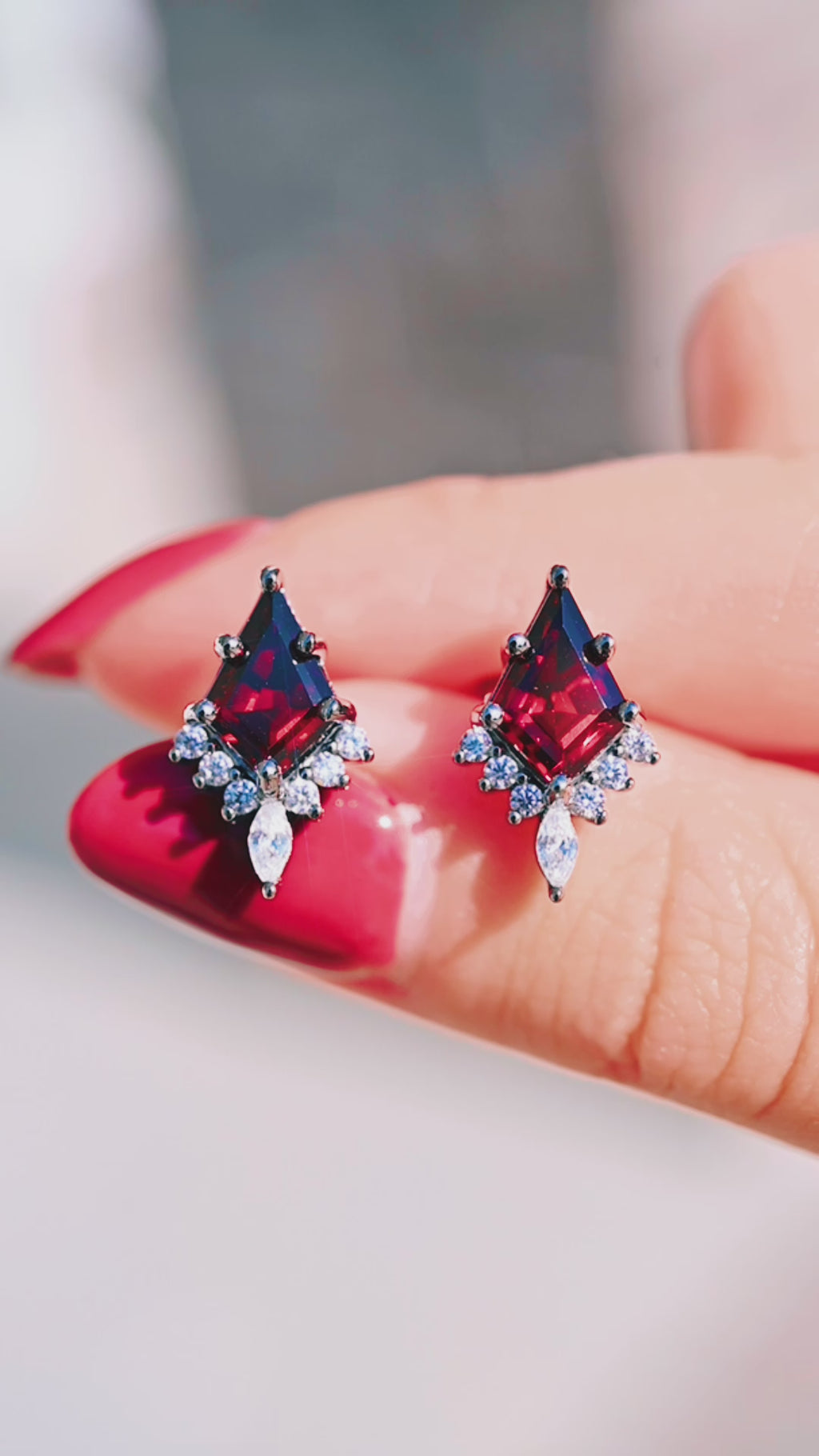 These exquisite Skye Kite® earrings embody the perfect balance of bold elegance and celestial artistry. Each stud showcases a natural red garnet in the signature kite-shaped cut, reflecting light like a burning ember beneath the night sky. The stones are set in black ruthenium over 925 sterling silver, giving them a rich, mysterious contrast that enhances their deep crimson glow.