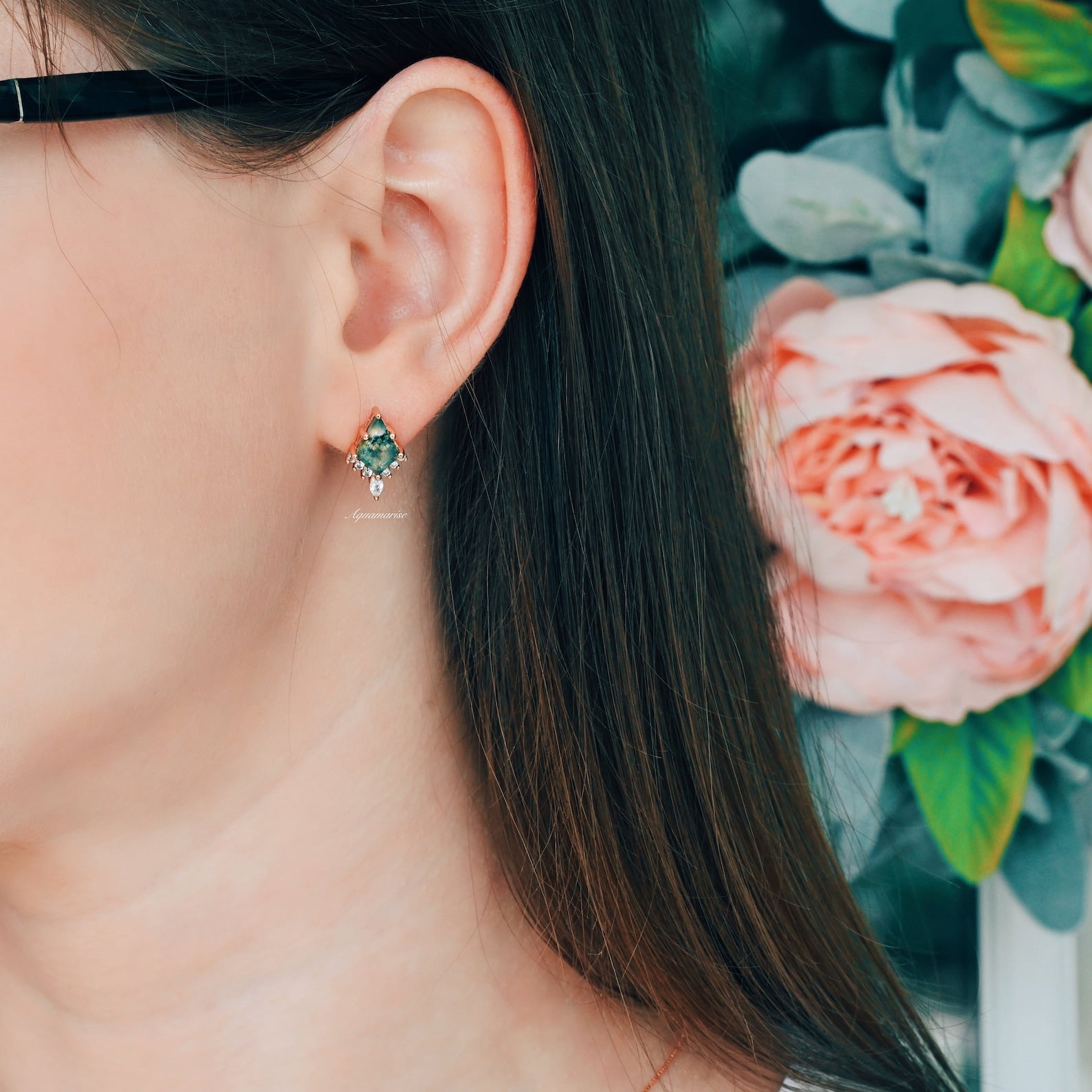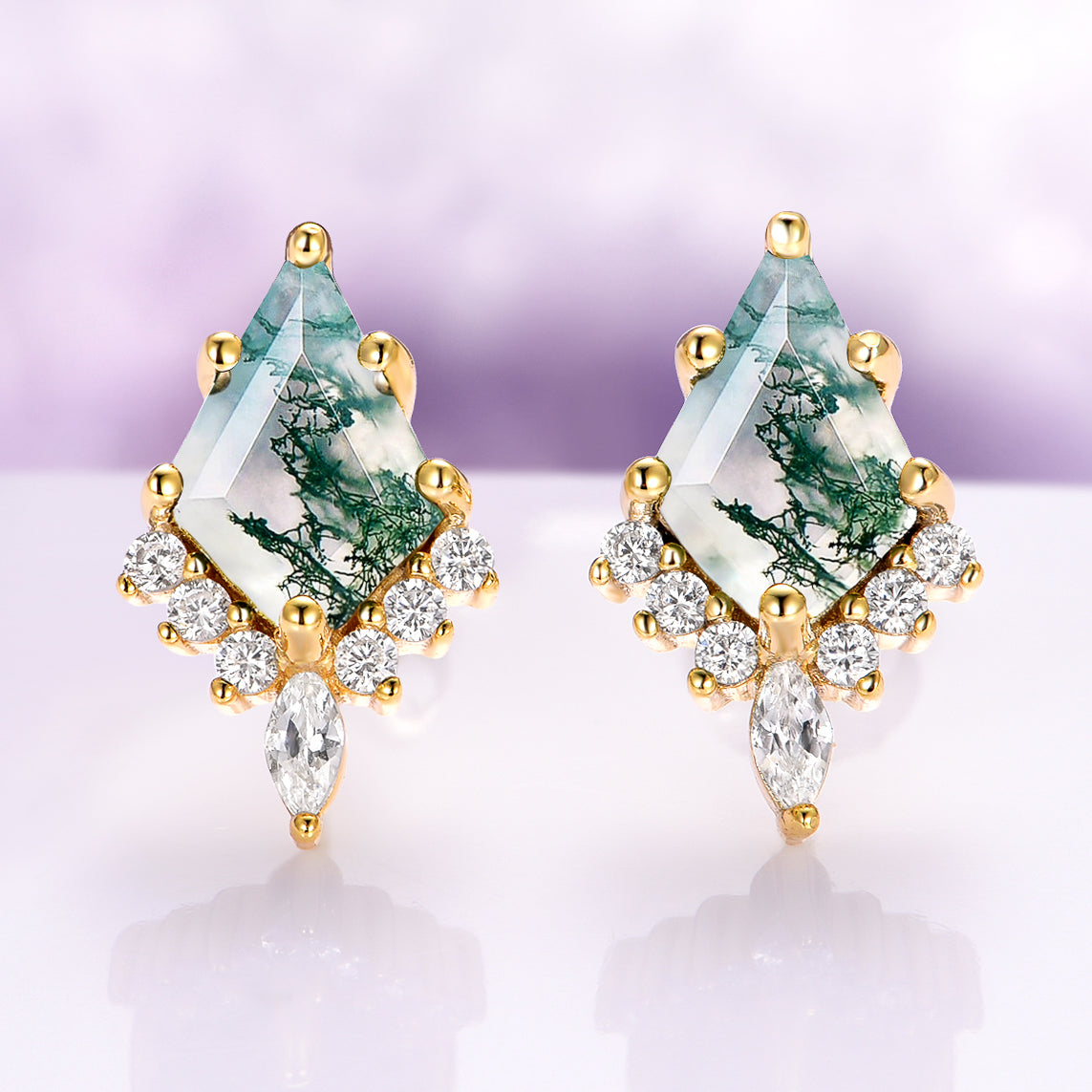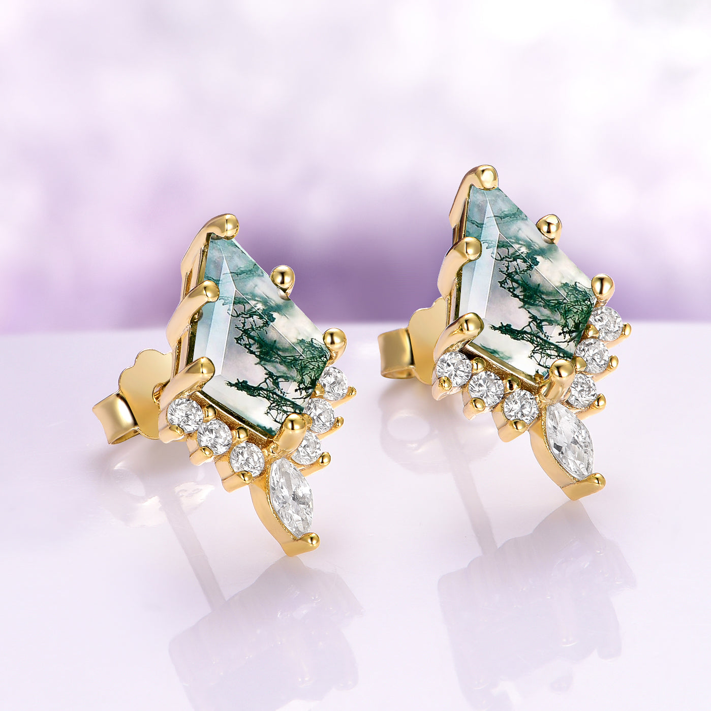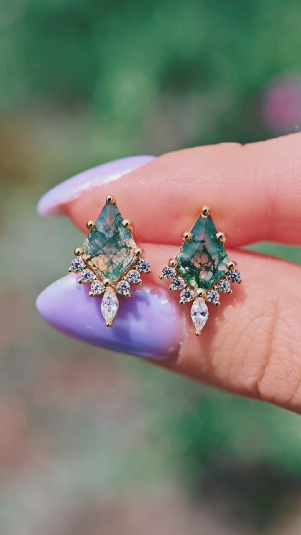 ►Each earring features a stunning kite-shaped green moss agate gemstone, meticulously cut to accentuate its natural patterns and colors. The verdant shades of green combined with subtle moss-like inclusions create a mesmerizing display that is both sophisticated and distinctive.