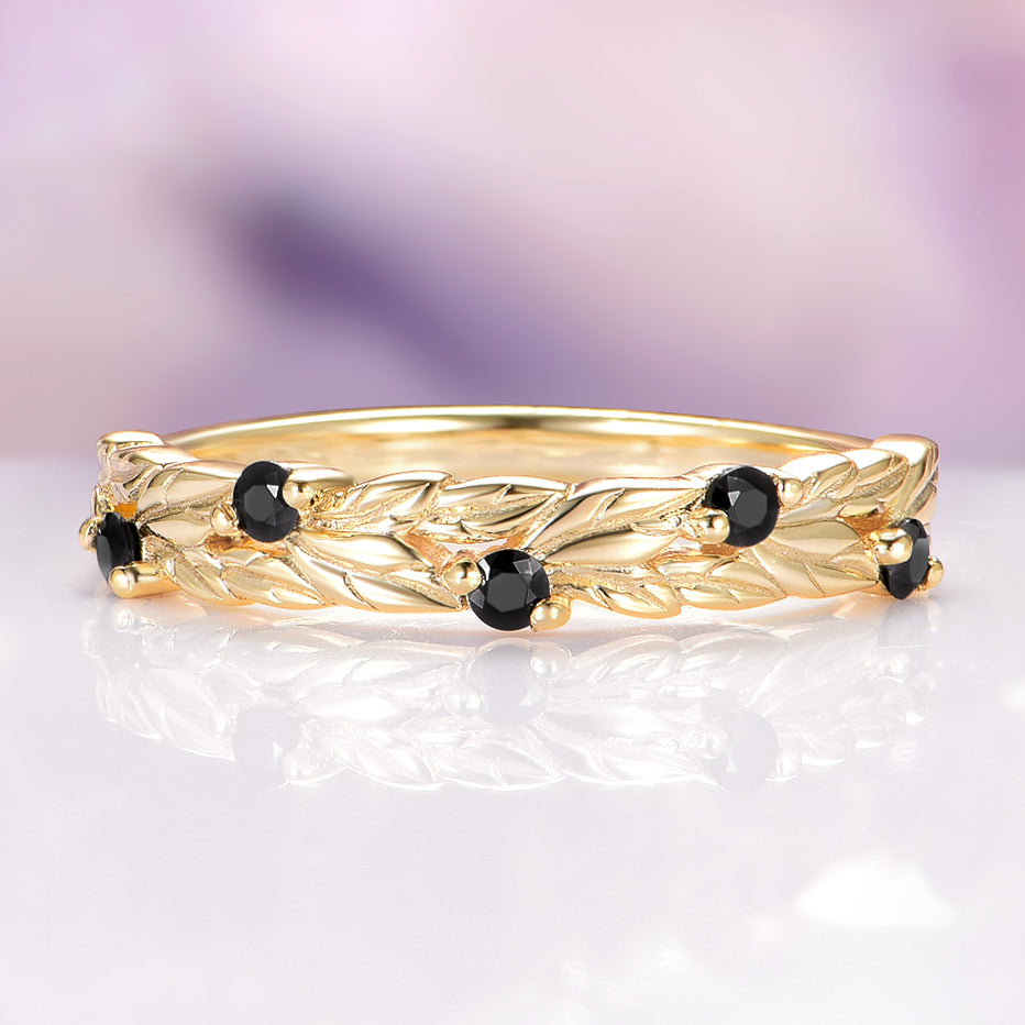 Striking, elegant, and beautifully symbolic—this Black Moissanite Leaf Band is handcrafted in 14K Solid Yellow Gold and designed for lovers of nature-inspired jewelry with a bold twist. Featuring delicately sculpted leaves woven around the band and accented by deep black moissanites, this ring embodies both enchantment and modern sophistication. Perfect as a wedding band, stacking ring, promise ring, or meaningful everyday piece.