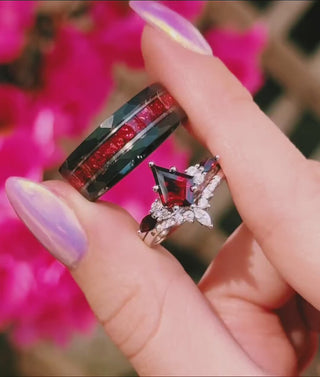 A bold blend of rugged texture and refined natural beauty. This men’s wedding band features a deep black tungsten carbide base with a striking crushed natural red garnet inlay, complemented by a sleek silver strip that adds modern contrast. The rich red tones of the garnet stand out against the hammered matte finish, creating a powerful, earthy aesthetic that feels both contemporary and timeless. Expertly crafted for everyday wear, this straight comfort-fit ring offers exceptional durability and a smooth, effortless feel. Perfect for those who appreciate bold materials, clean design, and a touch of natural intensity.
