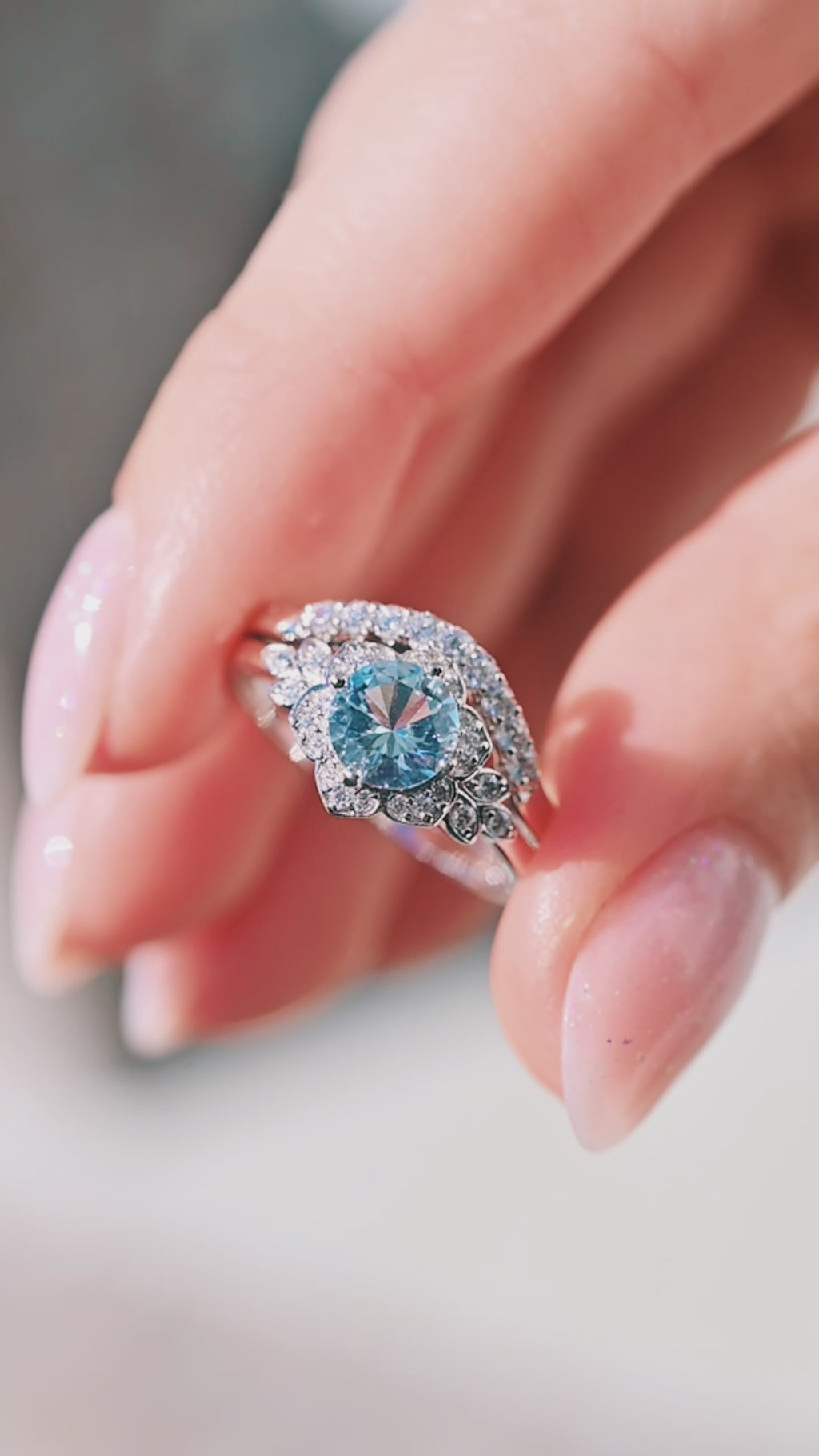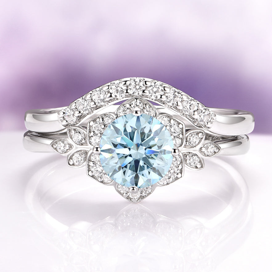 Introducing the Jasmine Round Cut Aquamarine Flower Engagement Ring Set, a romantic and nature-inspired design that embodies purity, serenity, and everlasting love. Handcrafted in solid 14K white gold, this enchanting two-piece set features a round-cut natural aquamarine that glimmers with the tranquil blue hues of clear waters. A delicately arranged petal-like design surrounds the center stone, creating a graceful floral motif with your choice of sparkling moissanite or natural diamonds. A perfectly matched wedding band completes the set, forming a harmonious symbol of natural beauty and devotion. Distinctly elegant yet timeless, the Jasmine design captures the essence of blooming love and enduring commitment.