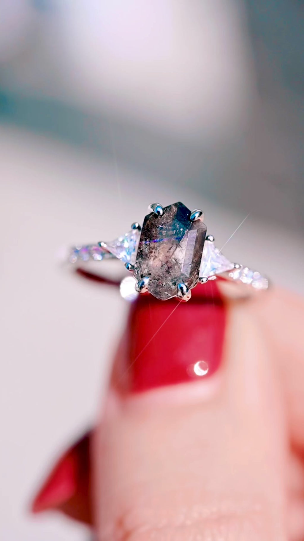Crafted in solid 14K white gold, this Herkimer diamond engagement ring blends natural beauty with refined brilliance. The organic inclusions of the natural Herkimer center stone pair seamlessly with the exceptional sparkle of D/VVS1 moissanite accent stones, creating a ring that feels both modern and enchantingly unique.
