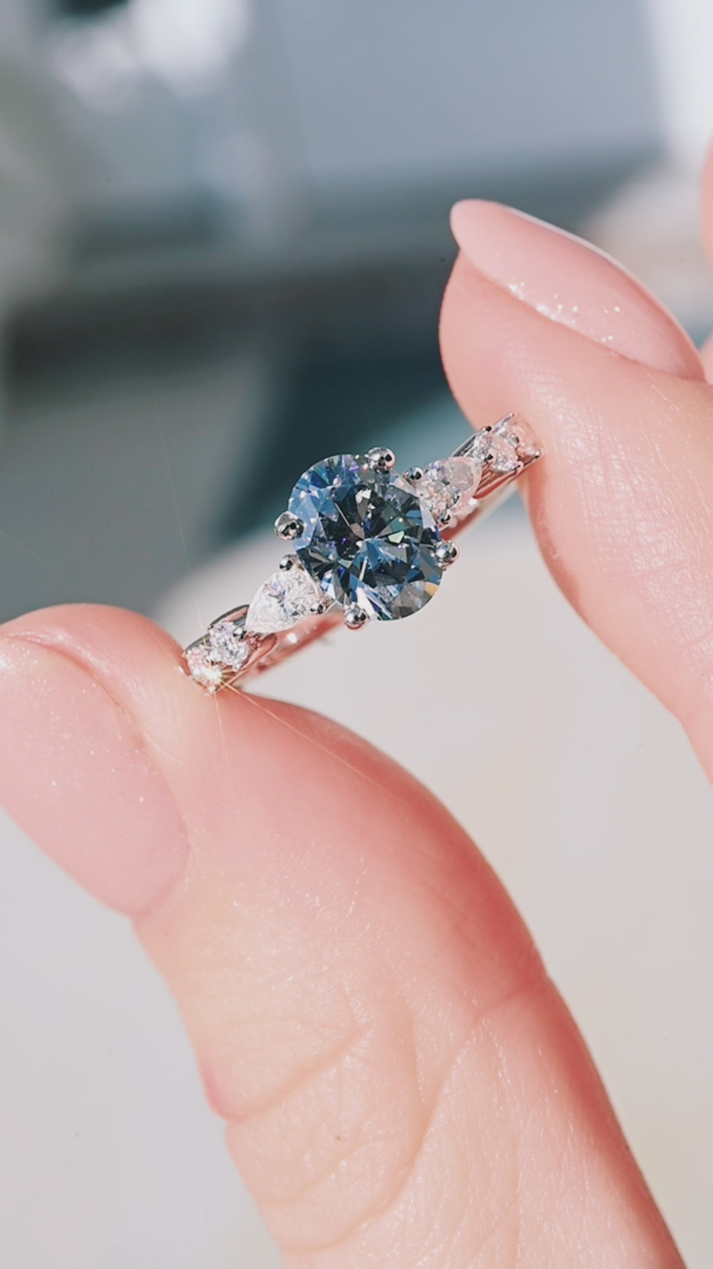 Accented with D color, VVS1 clarity moissanite side stones, the design enhances sparkle while maintaining graceful balance. The pear and round accent stones elongate the silhouette, giving the ring a soft romantic finish.