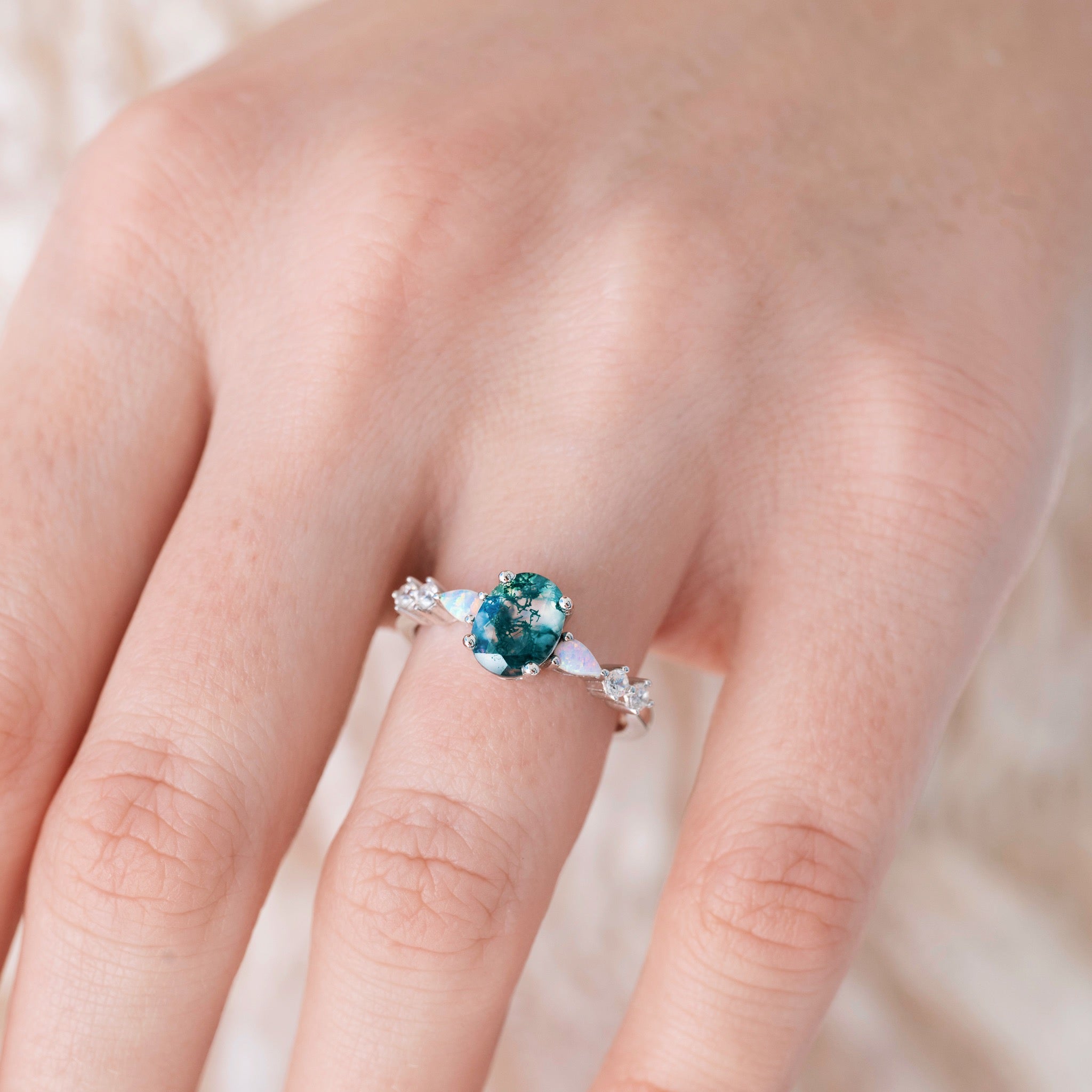 Oval Moss Agate Engagement Ring with Opal in 14K White Gold