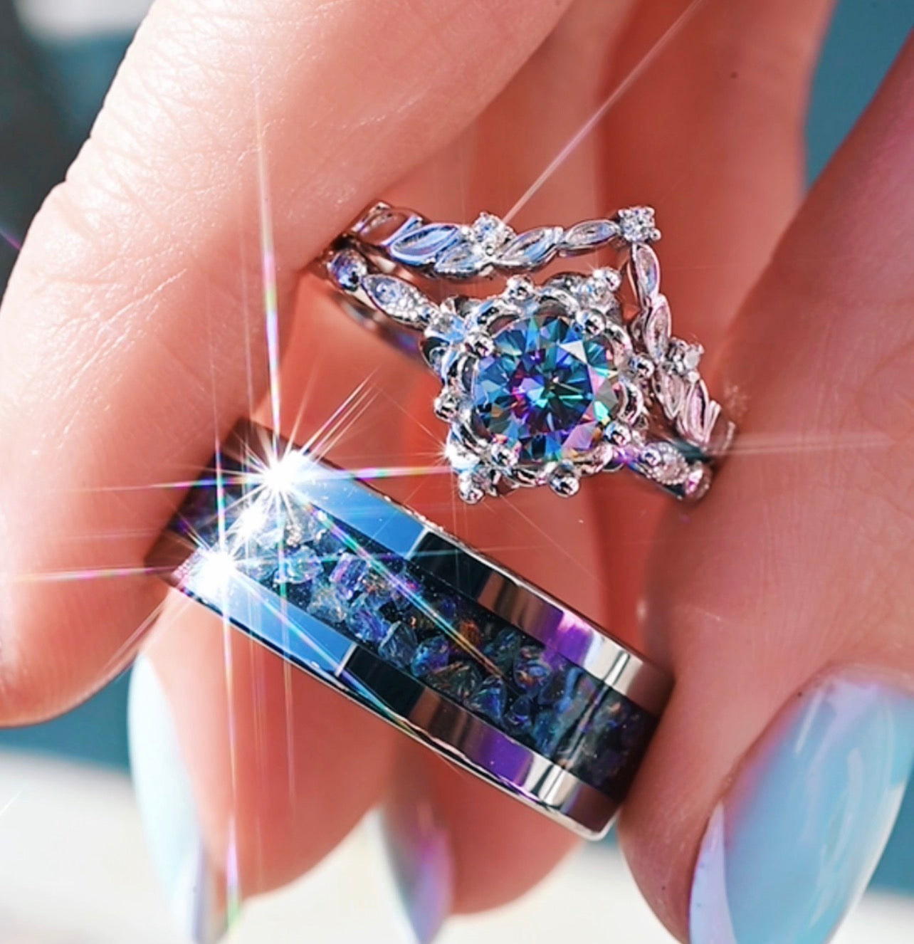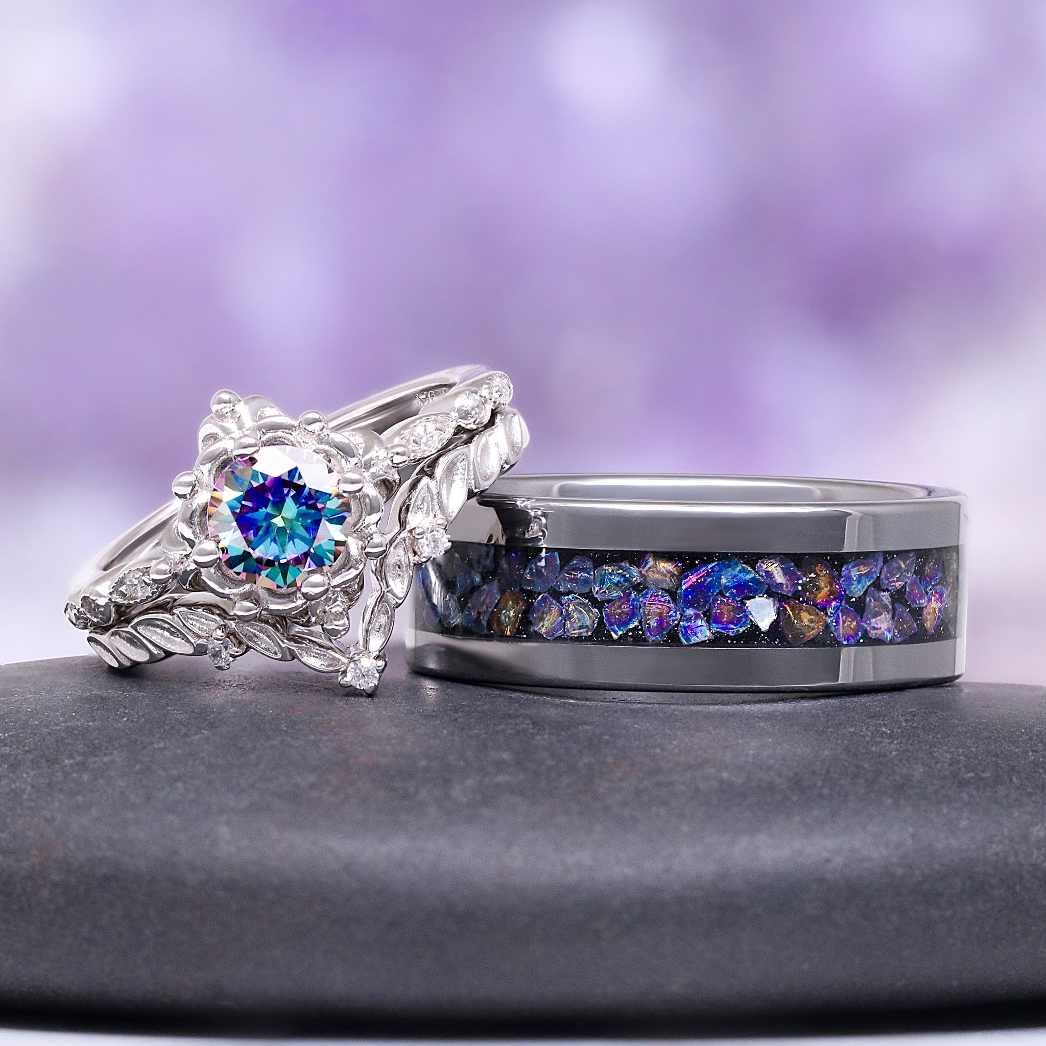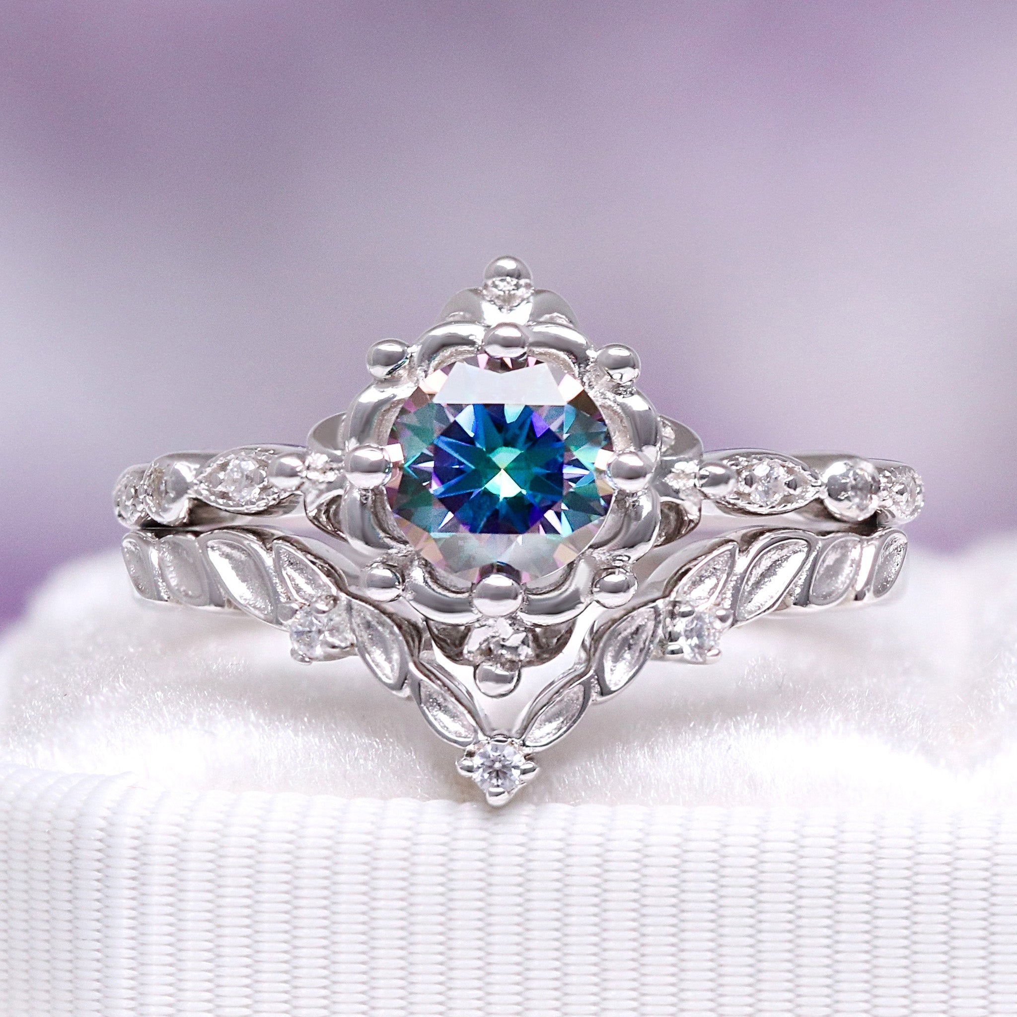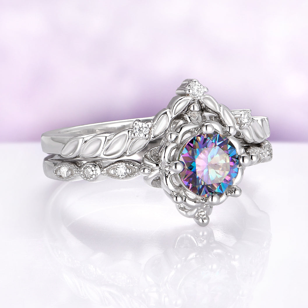 A luminous fantasy-inspired engagement ring crafted for those drawn to magic, nature, and timeless elegance. This enchanting leaf ring set features a brilliant rainbow moissanite center stone, surrounded by delicate fairy-like details and flowing leaf motifs.