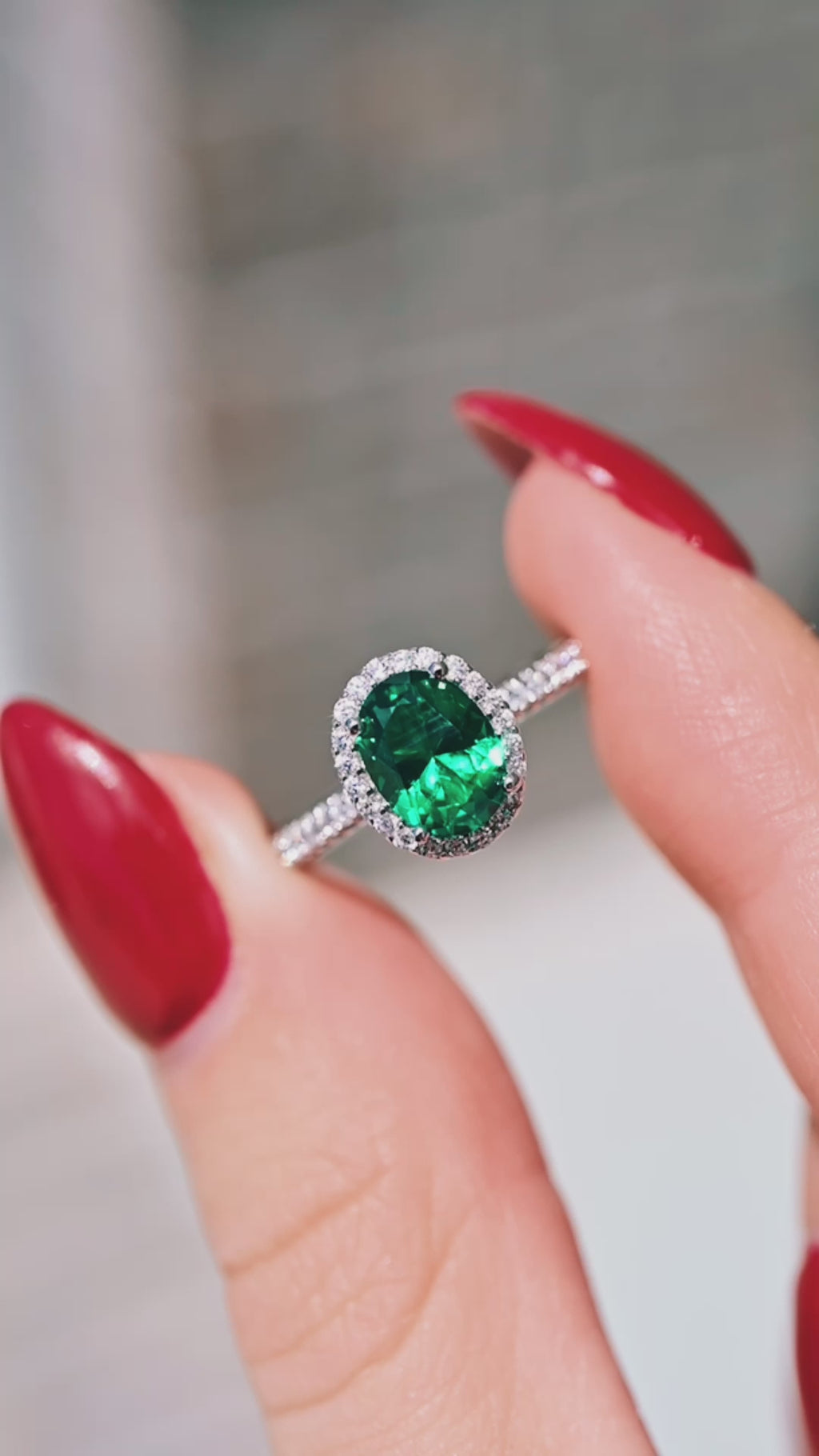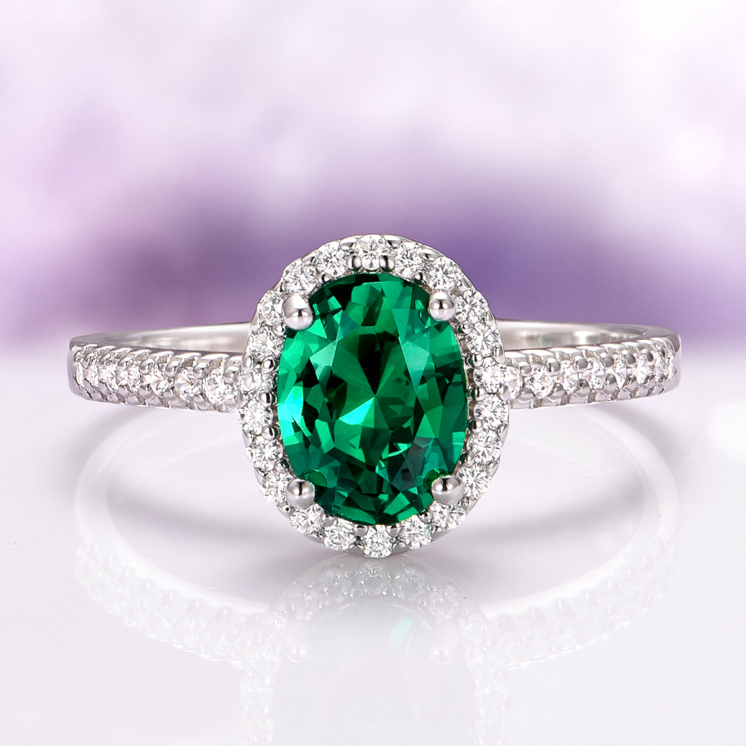 Iris Halo Oval Emerald Ring in Sterling Silver