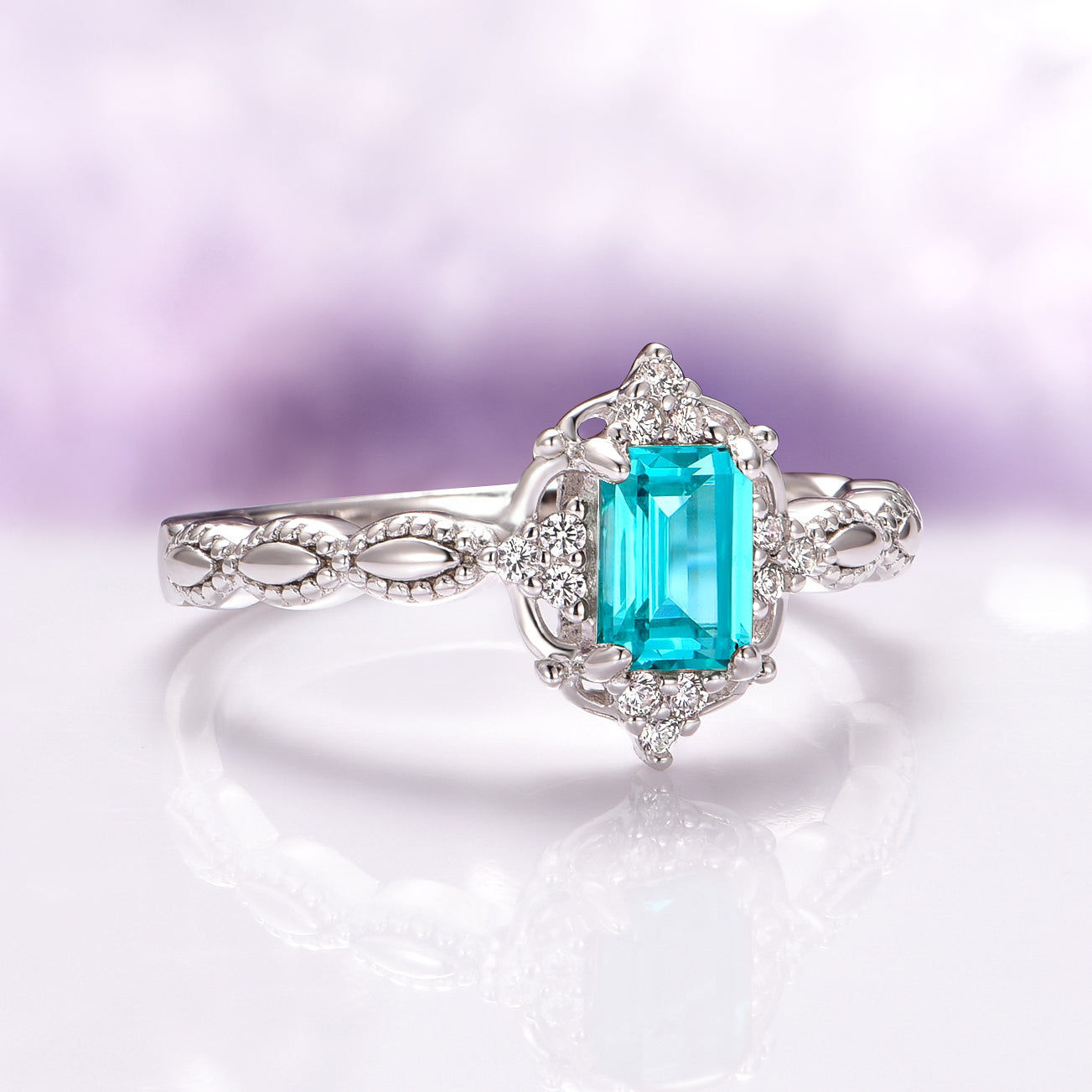 Make a statement with timeless elegance. This stunning vintage-inspired ring features a captivating emerald-cut Paraiba tourmaline in a vibrant turquoise hue, set in a solid 925 sterling silver band with a rhodium finish for added brilliance and durability.