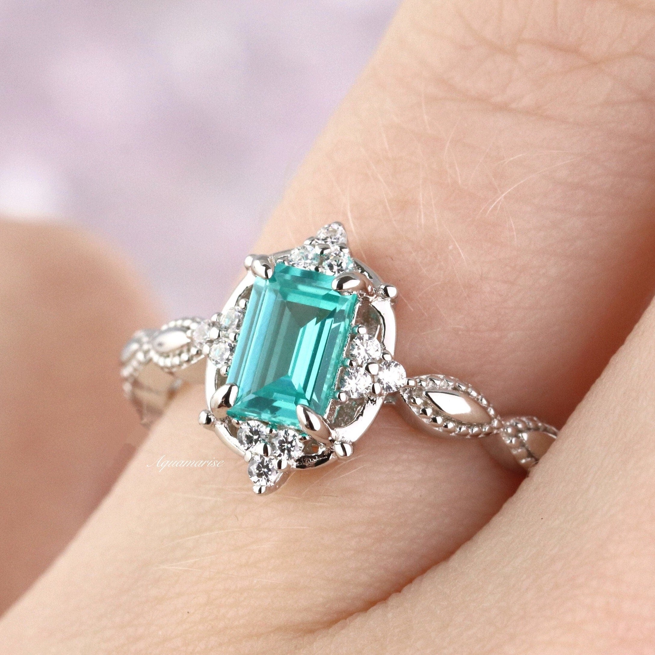 Gorgeous Vintage Inspired Paraiba Tourmaline Ring – Emerald Cut Turquoise Gemstone Ring in Sterling Silver