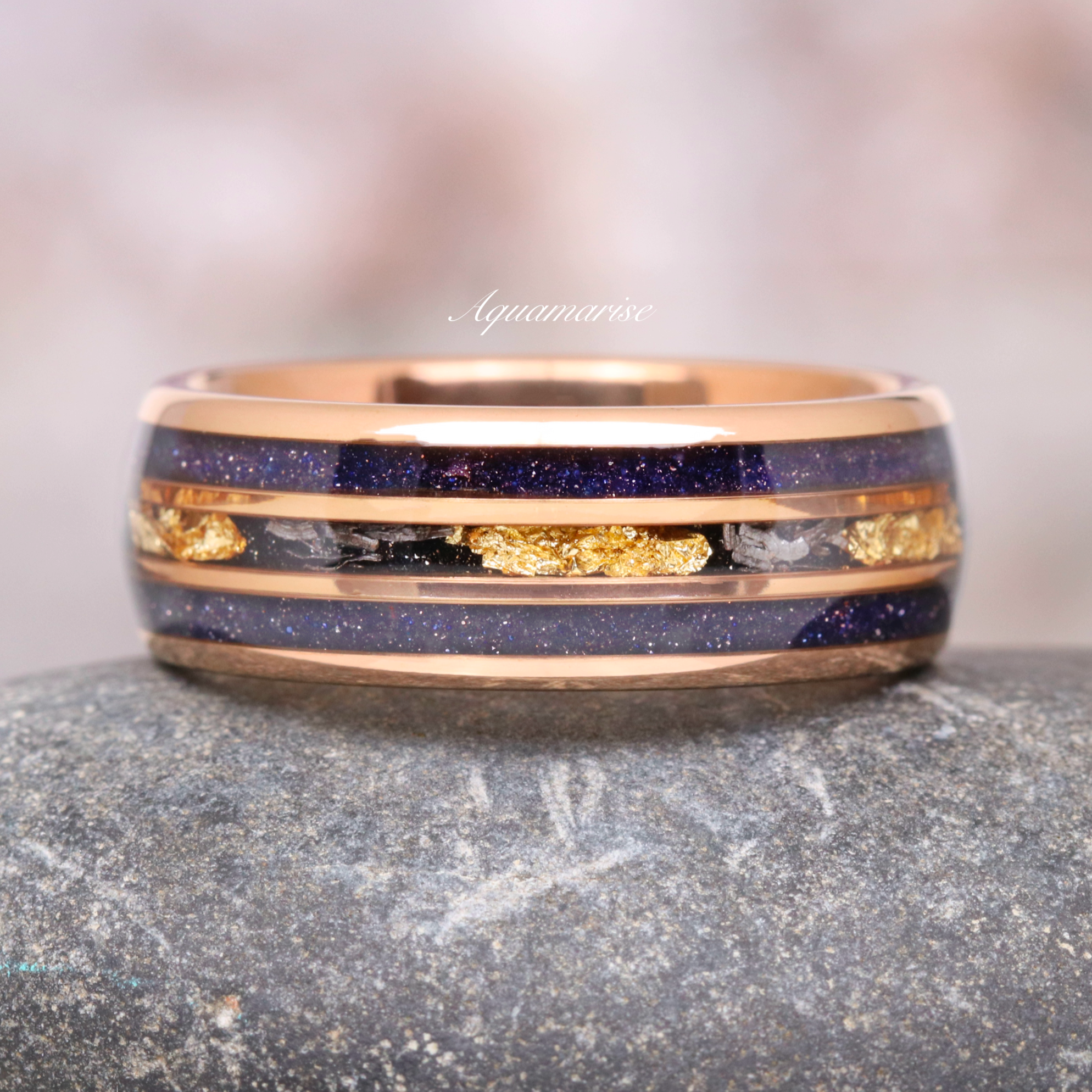 ►Material: Polished Tungsten Carbide, Rose Gold, Blue Sandstone (Goldstone), Crushed Meteorite Inlay, Gold Leaf Inlay.