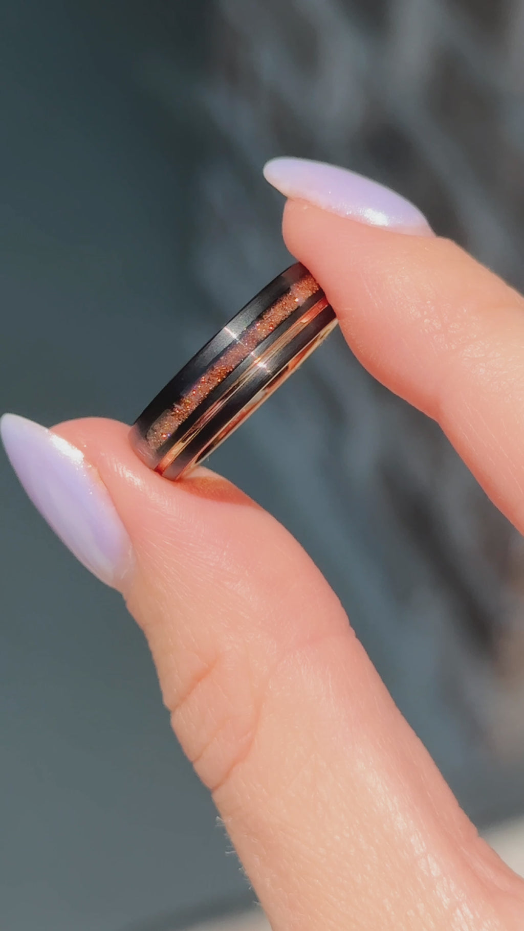 Experience the warmth and brilliance of our Solar Flare Orange Sandstone Men’s Wedding Band, a testament to enduring love and fiery passion. This striking 6MM ring combines the elegance of two-tone rose gold with the sleekness of black tungsten, offering a unique, modern aesthetic that stands out.