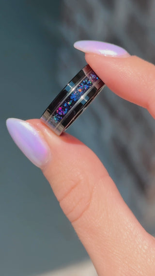 Embark on a cosmic journey with our Starry Night Men's Wedding Band, a masterful blend of celestial beauty and timeless durability. This 8mm tungsten ring, with its striking black finish and elegant silver strip, captures the essence of a night sky brimming with stars.
