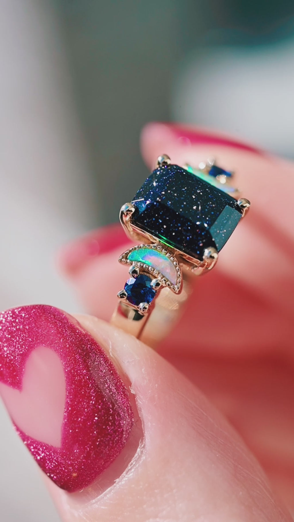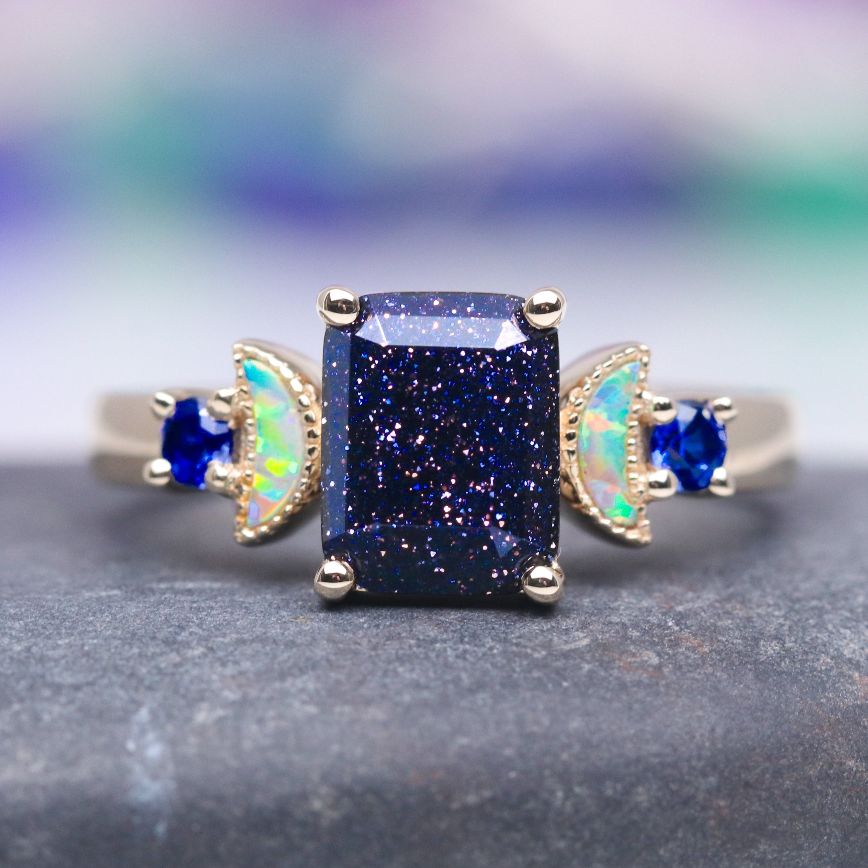 Starry Night and Crescent Moon Fire Opal Ring- 14K Solid Yellow Gold