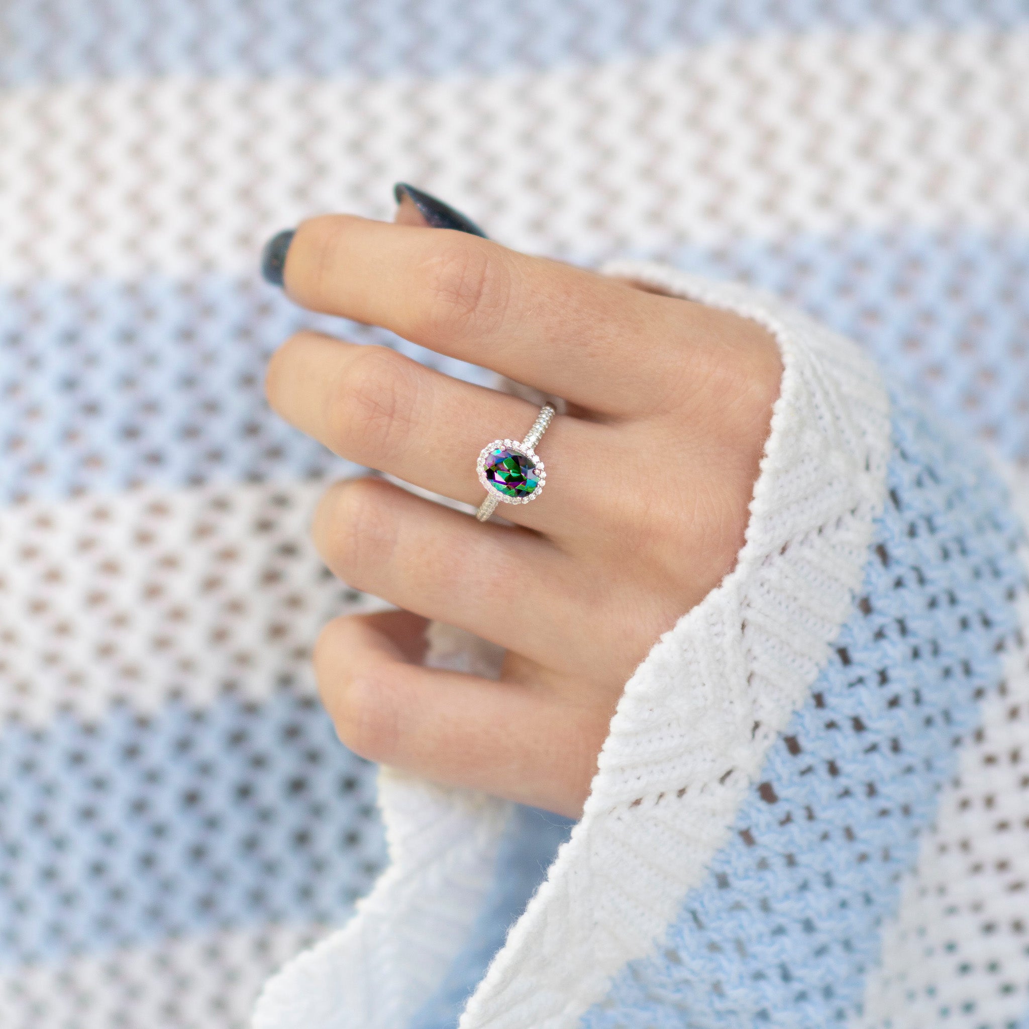 Make a bold and magical statement with this bestselling halo Mystic Topaz ring, designed to captivate with every glimmer. Set in solid 925 sterling silver with a durable rhodium finish, this ring features a stunning 8x6mm oval-cut Mystic Topaz—a natural white sapphire expertly treated to reveal iridescent hues of green, purple, and blue.