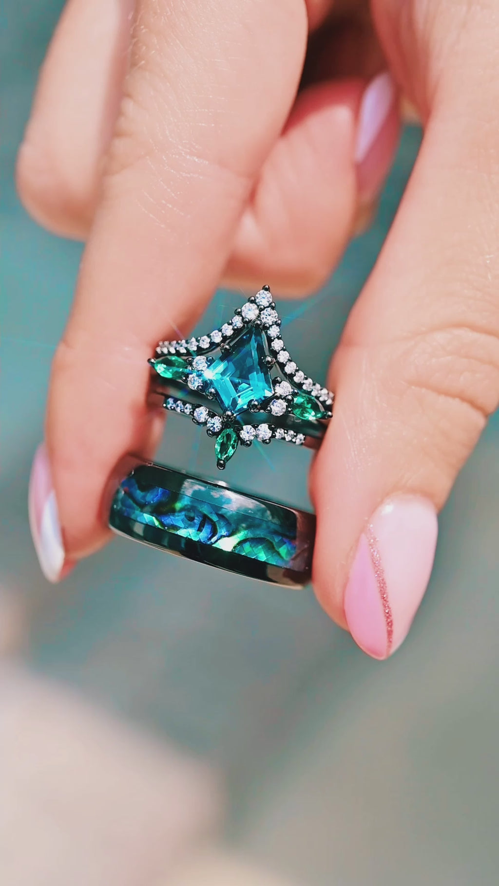 Crafted for lovers of celestial beauty, this matching London Blue Topaz & Starry Night couples ring set blends cosmic elegance with nature-inspired design. Whether you're drawn to starry night skies, deep ocean blues, or a love that reaches beyond the ordinary, this set is perfect for those who crave something unique and meaningful.