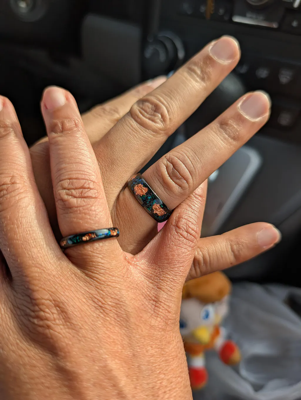 ►Material: tungsten carbide, crushed peacock opal, rose gold leaf.