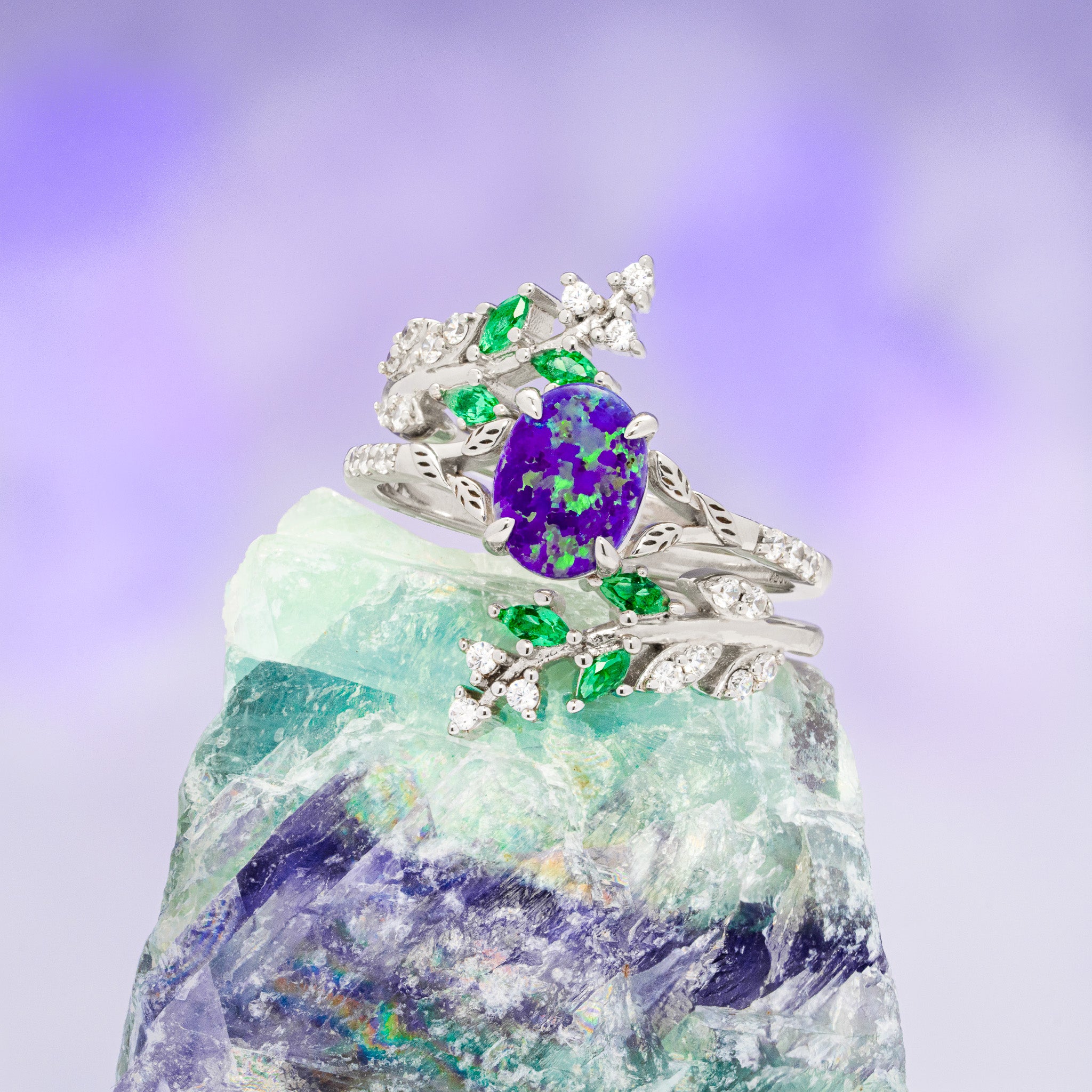Lavender Fire Opal & Emerald Leaf Couples Ring Set