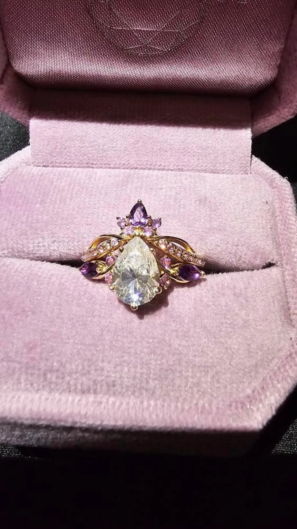 Step into a world of enchantment with this Fairy Amethyst & Moissanite Engagement Ring Set in 14K yellow gold. Designed for the woman who dreams of magic and elegance, this set beautifully blends whimsy with timeless sophistication.