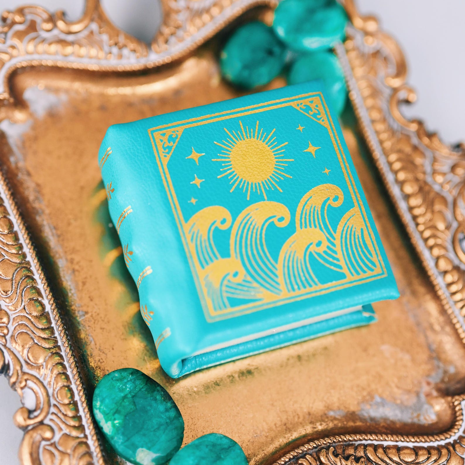 Dive into the sunlit shores of the Summer Court with this enchanting Ocean Tide Book Ring Box, inspired by the coastal magic of A Court of Thorns and Roses. Wrapped in vibrant teal vegan leather and embossed with golden waves and a radiant sun, this miniature storybook captures the essence of ocean breeze and eternal summer.