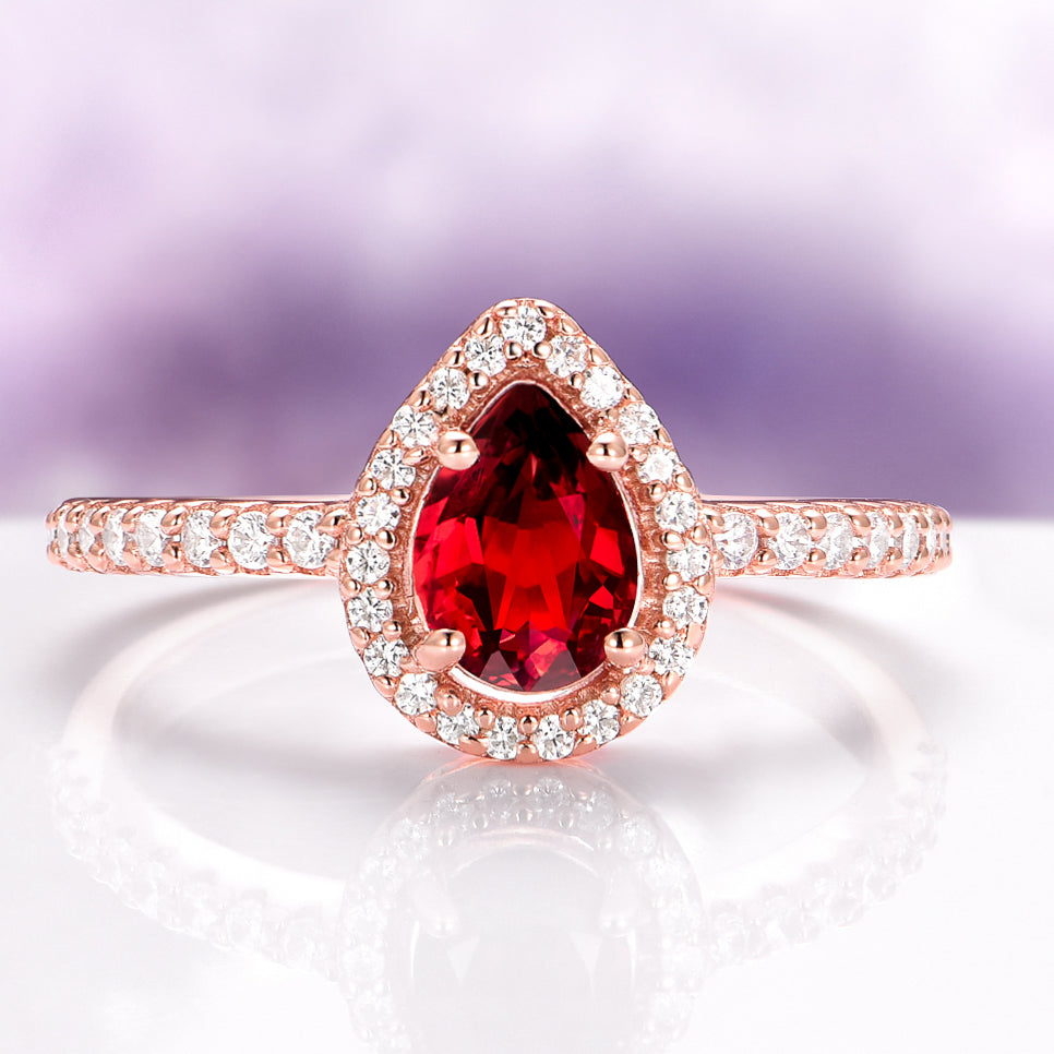 Elegant and timeless, this Teardrop Garnet Ring features a natural pear-cut garnet set in 14K Rose Gold Vermeil over 925 Sterling Silver. Framed with sparkling simulated diamonds, this design offers a refined balance of warmth and brilliance—perfect for anniversaries, birthdays, or a meaningful everyday accessory.