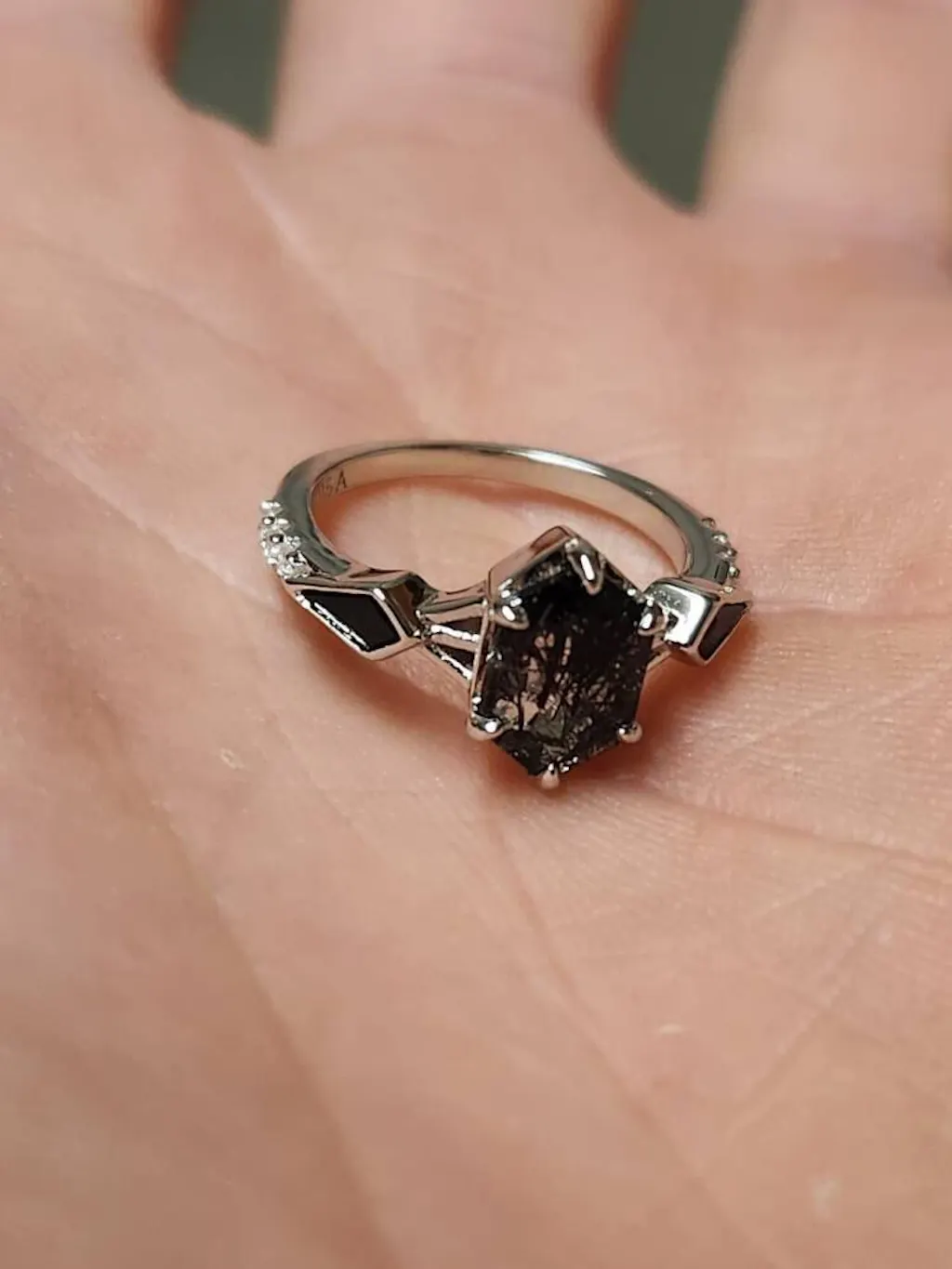 Hexagon Cut Natural Rutilated Quartz & Kite Cut Black Onyx Ring Set, a stunning embodiment of timeless elegance and shared love. Crafted with meticulous attention to detail, this enchanting ring set is a symbol of connection, harmony, and the unique bond between two individuals.