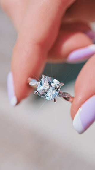Make a timeless statement with this Gorgeous Twisted Vine Cushion Cut White Sapphire Ring, designed for the modern romantic who dreams of elegance with a hint of nature’s charm. This captivating ring features a sparkling lab-grown white sapphire in a soft cushion cut, wrapped in a nature-inspired twisted vine band.