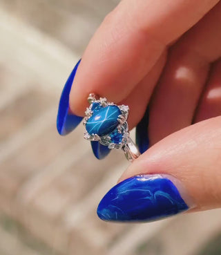 Embrace the enchantment of the Esme Star Sapphire Engagement Ring, a perfect blend of elegance and fantasy. Crafted from 925 sterling silver, this stunning ring features a captivating star sapphire that glimmers with every movement, reminiscent of a starlit sky. Inspired by the magical realms of fantasy, the Feyre design showcases intricate details that make this ring truly unique.