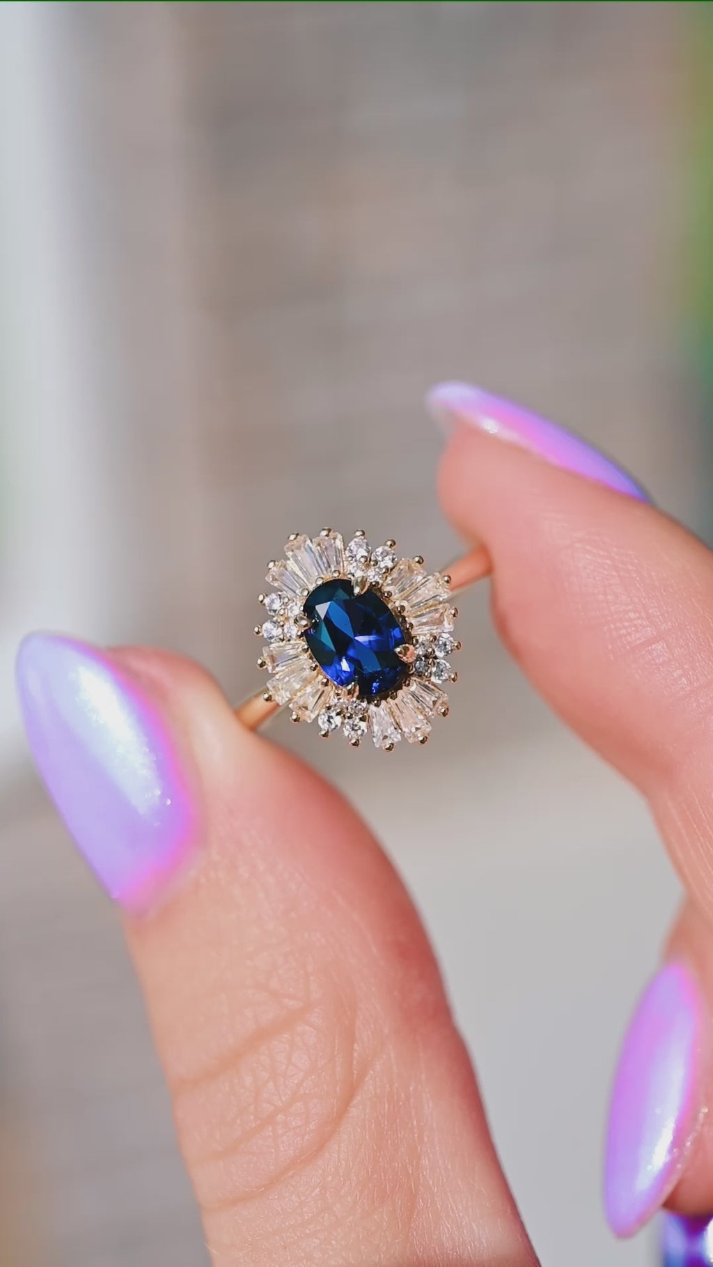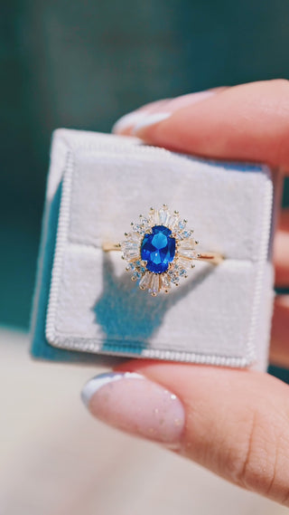 The Victoria Sapphire Ring in 14K solid yellow gold is a stunning vintage-inspired piece, featuring a captivating oval-cut blue sapphire as its centerpiece. Encircled by brilliant moissanite accents, this ring exudes timeless elegance and sophistication. The deep blue sapphire symbolizes wisdom, loyalty, and nobility, while the sleek solid yellow gold band provides a classic and refined setting. With its radiant sparkle and vintage charm, this ring is perfect for an engagement, anniversary gift, or heirloom piece, making it an exquisite choice for those who appreciate elegant and timeless fine jewelry.