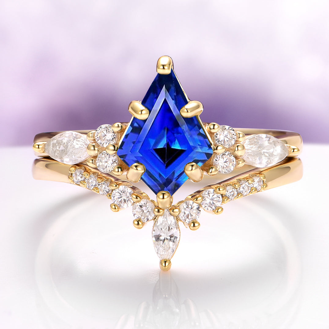 Crafted in 925 solid sterling silver with a luxurious 14K yellow gold vermeil finish, her engagement ring showcases a stunning kite-cut lab-created blue sapphire framed by shimmering simulated diamond accents. The matching band completes the romantic silhouette.