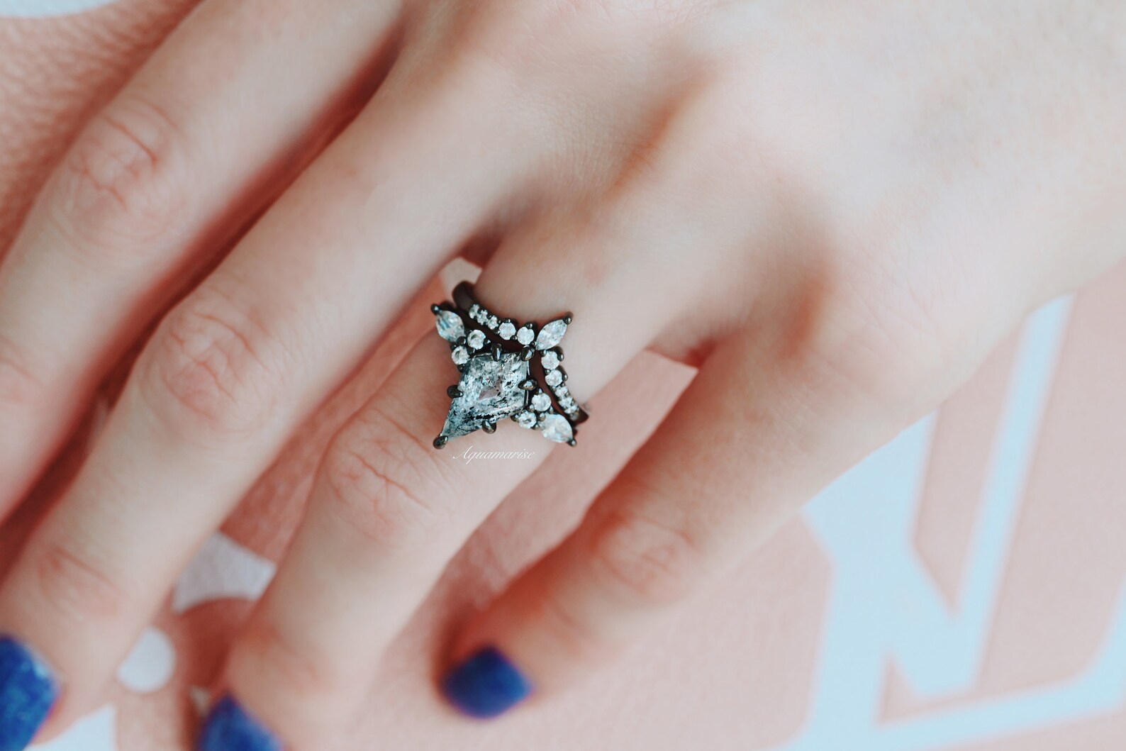 An art deco Skye Kite® cut natural Herkimer diamond ring set in 925 solid sterling silver with a black ruthenium finish beautifully captures the essence of cosmic sophistication. This captivating design combines the raw beauty of nature with a modern edge, making it a perfect choice for those who appreciate unique, meaningful jewelry.