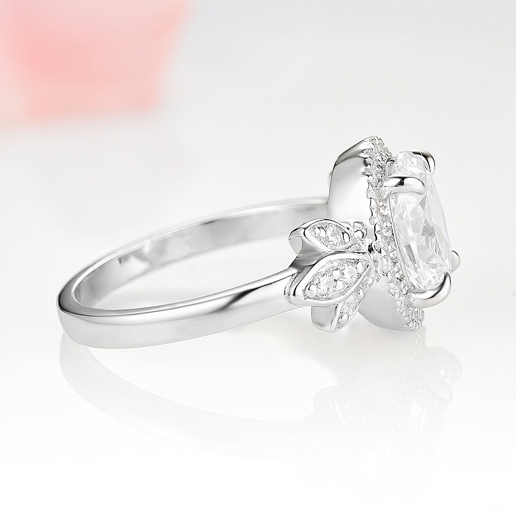 This elegant ring features an open basket with round prongs that cradle the center gem. The floral design makes this ring truly spectacular.