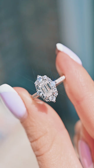 This vintage-inspired engagement ring exudes timeless elegance. Its elongated emerald-cut moissanite center stone is framed by a shimmering scalloped pavé band that extends halfway around the ring, creating a refined sparkle from every angle. The moissanite-encrusted gallery adds a touch of old-world glamour, making this design both classic and captivating.