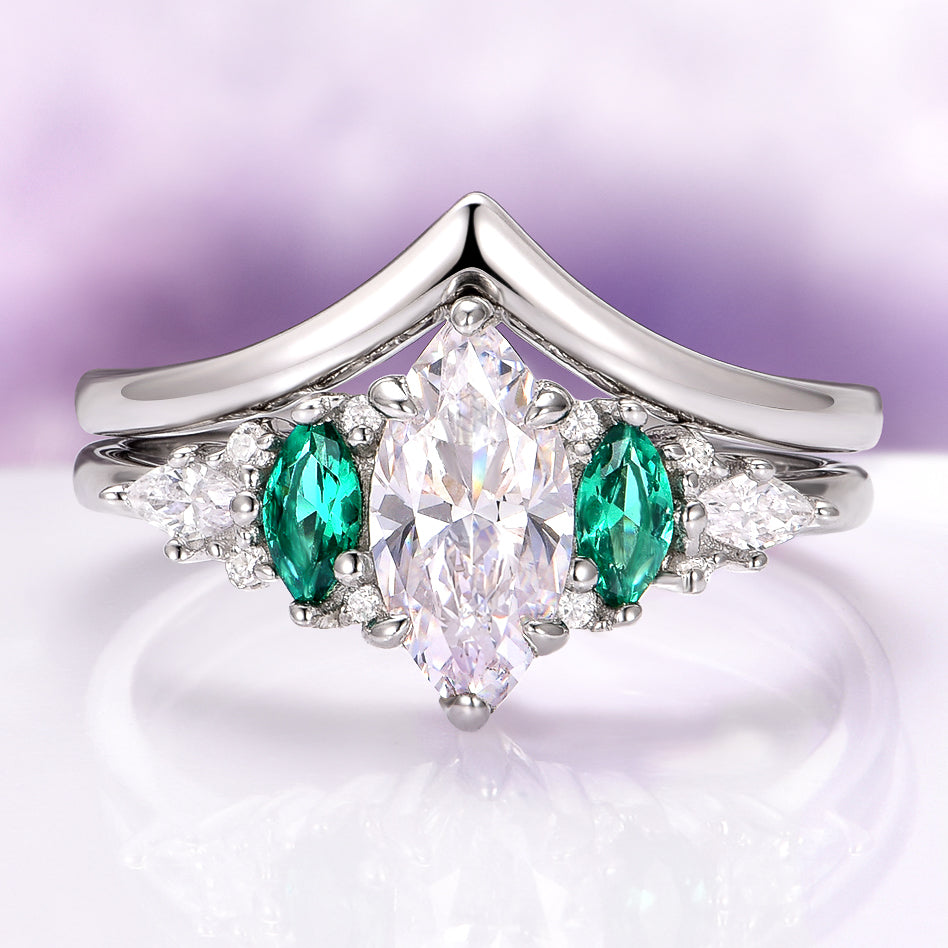 Emerie Marquise Cut Moissanite & Emerald Engagement Ring Set