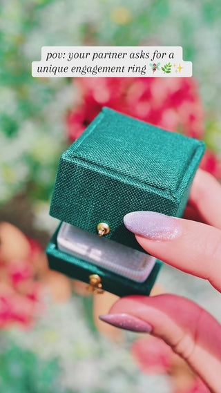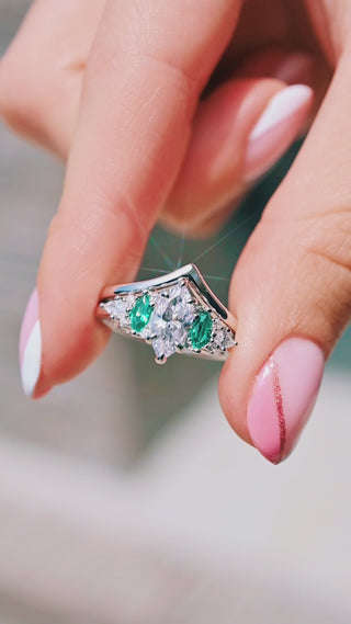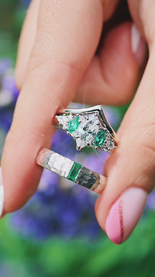 Crafted in 14k white gold, the Emerie Ring Set is a stunning blend of elegance and uniqueness. Featuring a marquise cut moissanite center stone accented by vibrant emeralds, this ring symbolizes love and renewal.