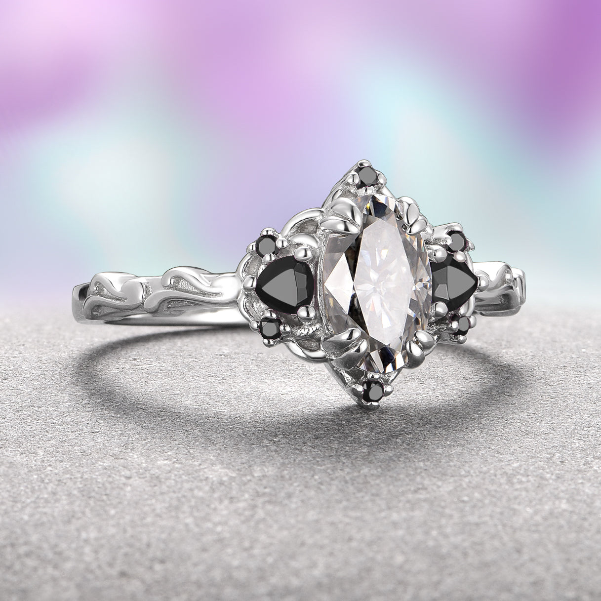 Delicate and captivating, the Esme Ring in 925 Sterling Silver features a striking gray moissanite center stone, framed by bold black onyx accents. This non-traditional engagement ring seamlessly blends timeless elegance with a sleek, modern twist, making it a perfect choice for those who seek something truly distinctive.