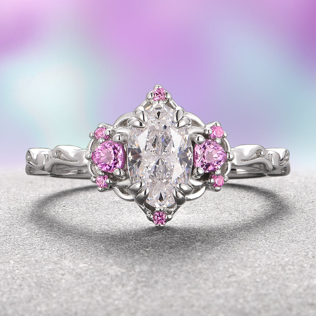►Moissanite is celebrated for its extraordinary brilliance and fire, symbolizing everlasting love and clarity. The vibrant pink sapphires add a touch of whimsy and are cherished for their symbolism of passion, joy, and strength. Together, these stones create a harmonious and eye-catching design that’s ideal for lovers of fantasy-inspired jewelry, fairycore engagement rings, and distinctive gemstone jewelry. Whether chosen as a unique engagement ring, promise ring, or special occasion gift, the Esme Ring brings ethereal beauty and bold color to any love story.