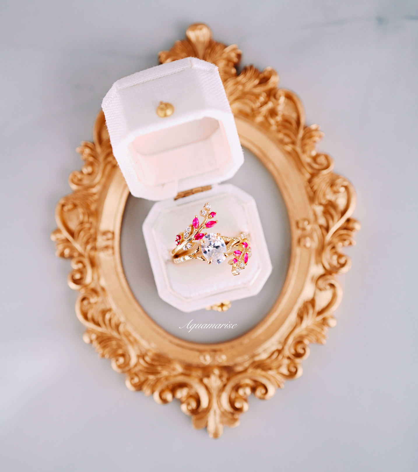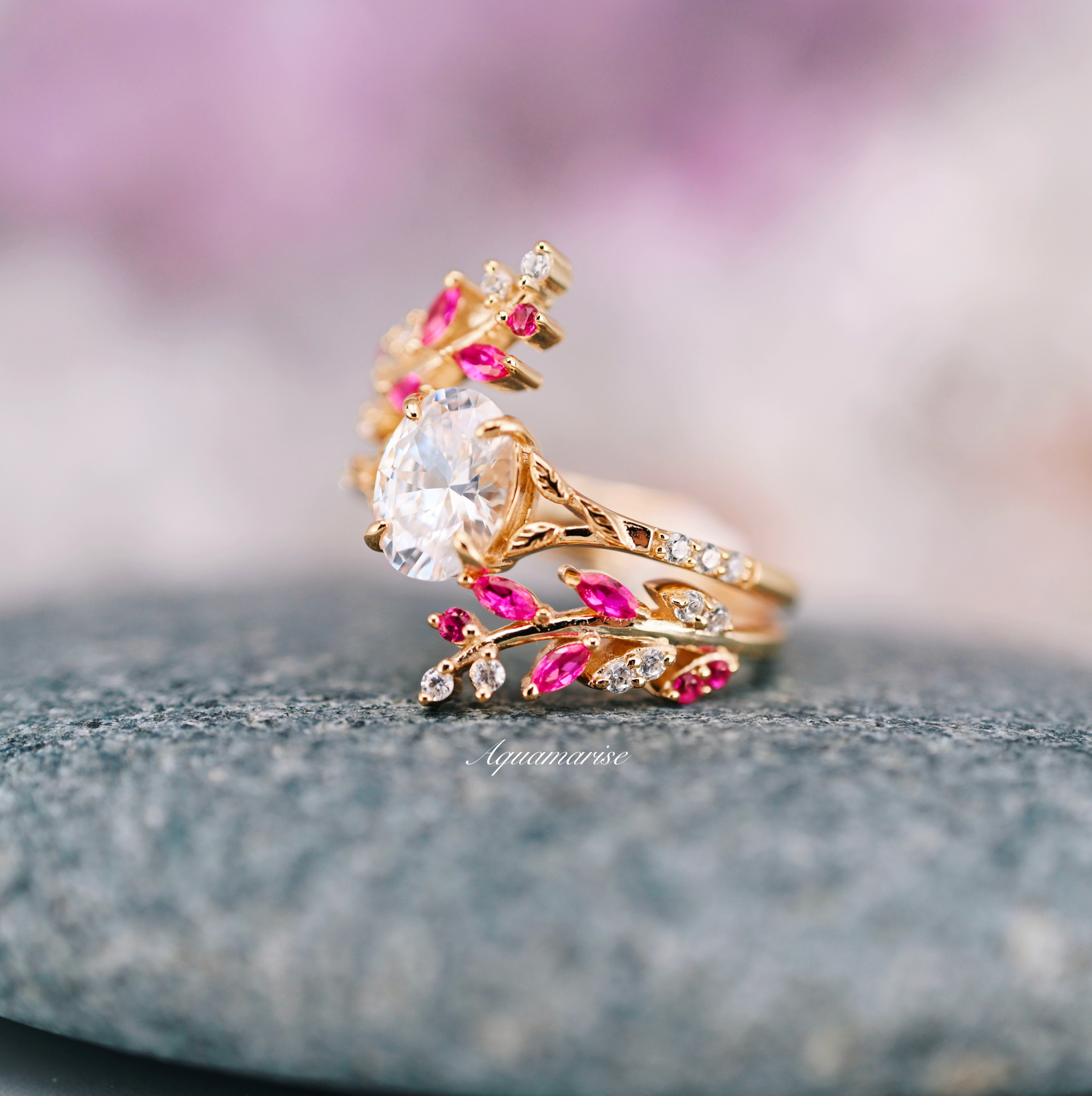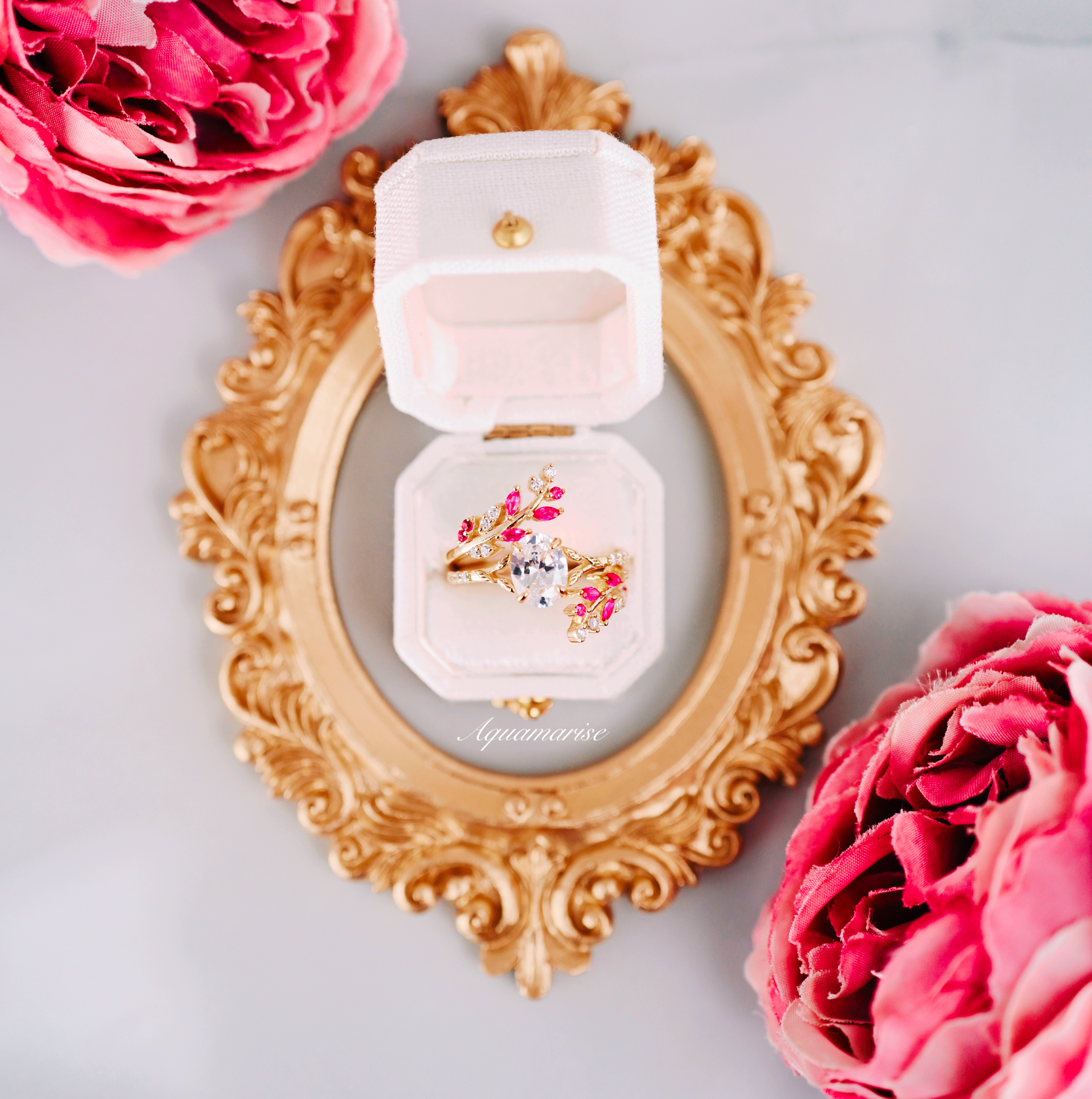Oval Cut Moissanite & Ruby Leaf Engagement Ring Set in 14K Solid Yellow Gold