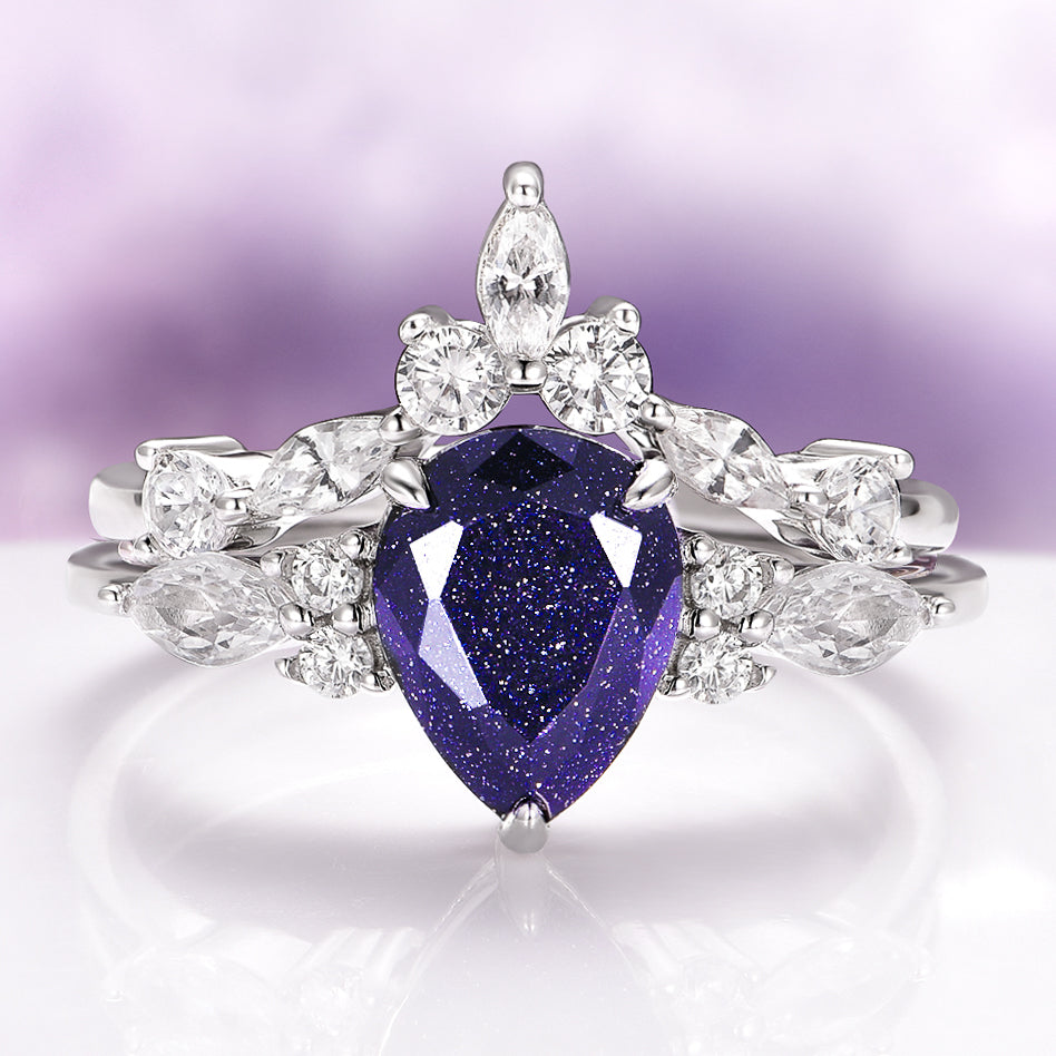 ►Inspired by the magic of a starlit sky, the Skye Starry Night Engagement Ring Set captures the beauty of the cosmos in a design that's as enchanting as it is timeless. The deep blue sandstone center stone shimmers with flecks of light, reminiscent of stars scattered across the night sky. The round-cut gemstone sits gracefully in a sleek 14K solid white gold setting, its cool tones complementing the celestial charm of the stone.