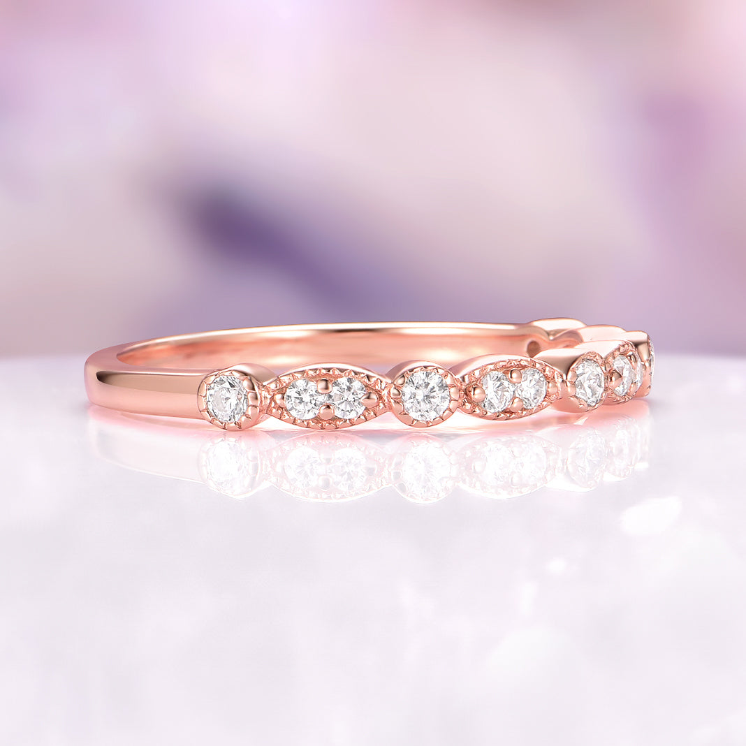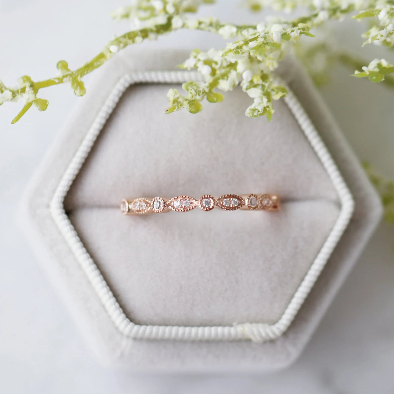 A romantic nod to old-world craftsmanship, this vintage-inspired band features alternating marquise and round settings adorned with natural, conflict-free diamonds. Handcrafted in 14K solid rose gold, it exudes timeless charm and pairs beautifully with vintage or modern engagement rings alike.