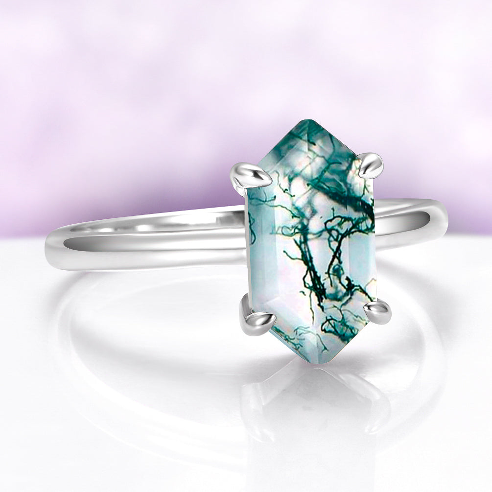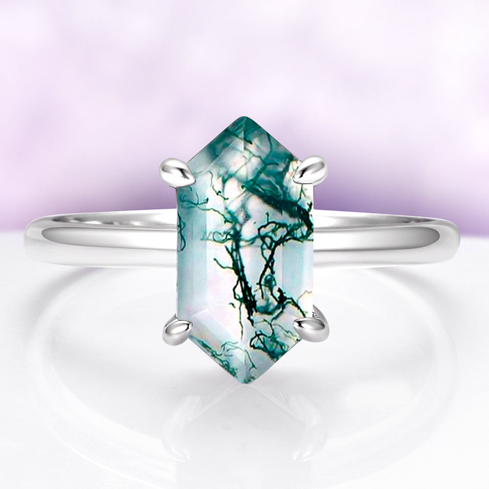 A gorgeous minimalist moss agate ring designed for lovers of nature-inspired, non-traditional jewelry. Featuring a natural hexagon-cut green moss agate set in solid 925 sterling silver, this ring offers an effortlessly elegant look with organic character and timeless appeal.