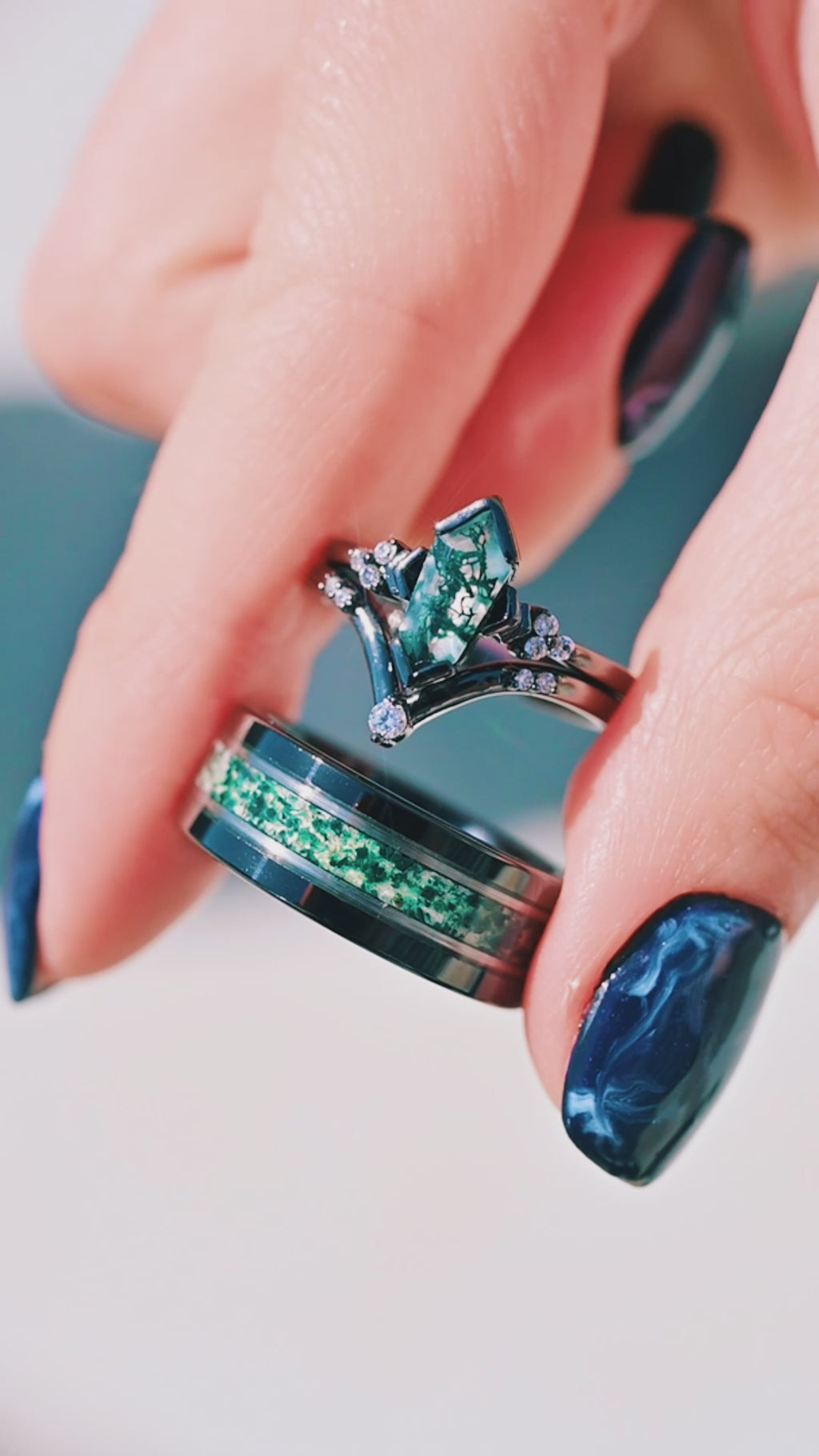 Hexagon Coffin Green Moss Agate Engagement Ring Set in Black Ruthenium
