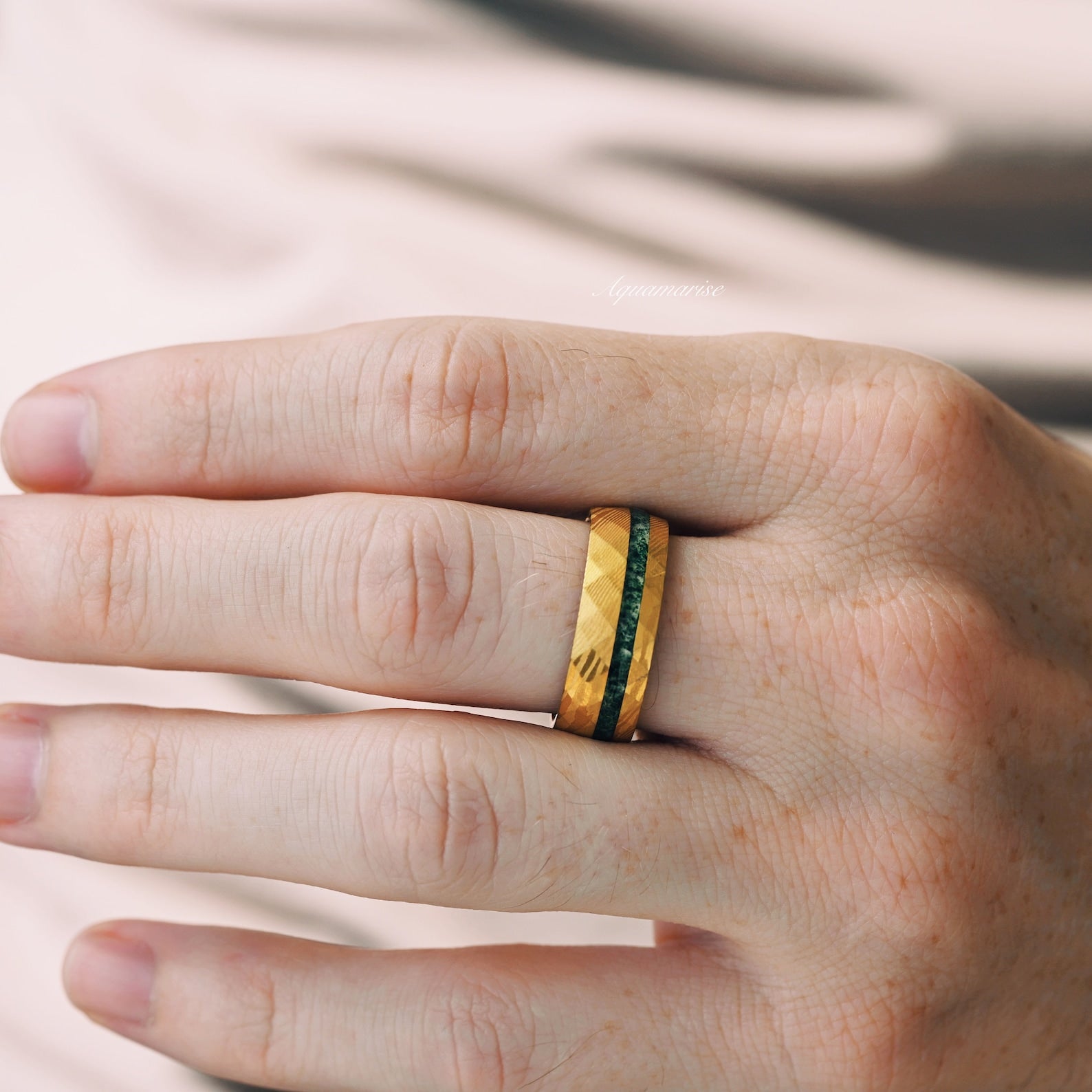8mm gold Damascus steel band with a mesmerizing inlay of crushed natural green moss agate. Finished with a protective coating to resist water, dirt, and daily wear.