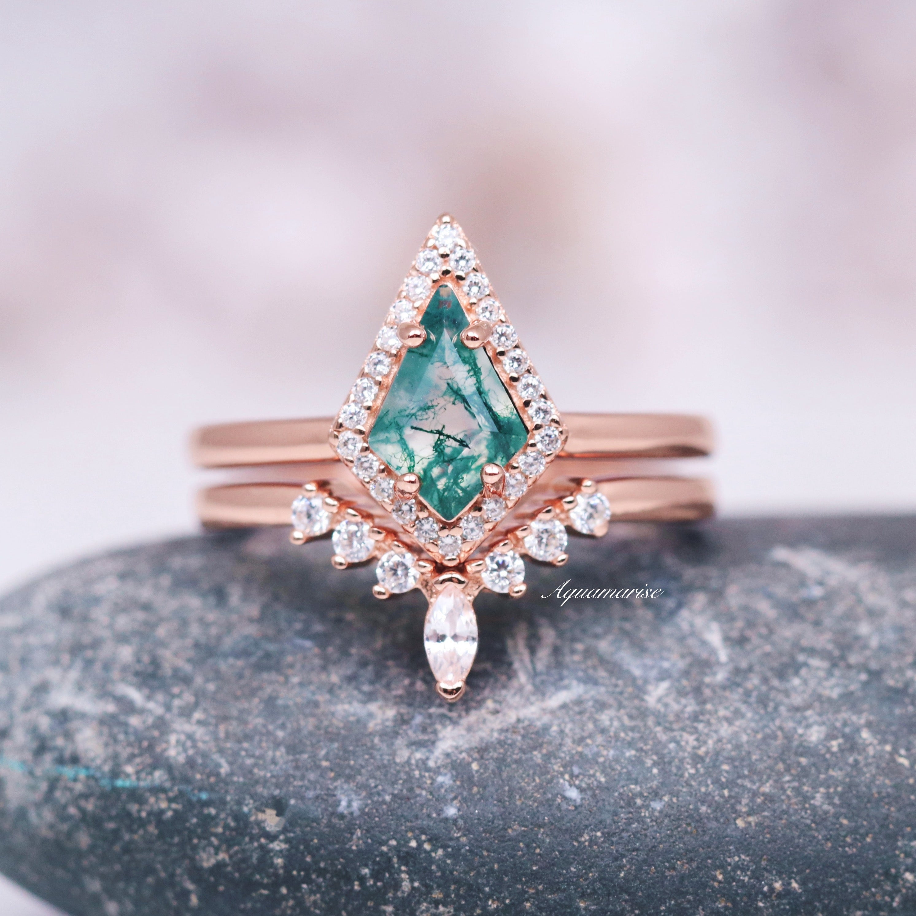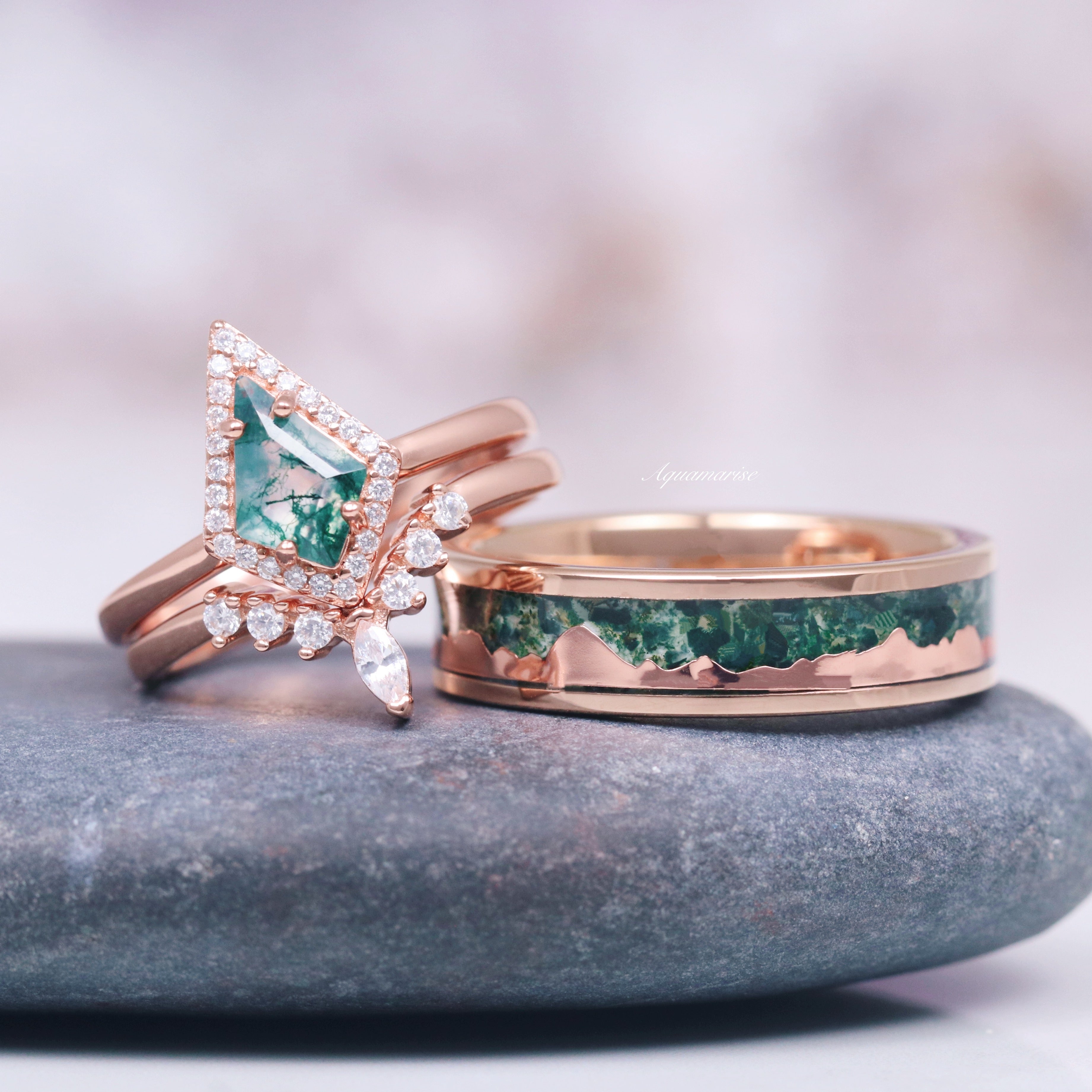 Mountain Range Green Moss Agate Couples Ring Set
