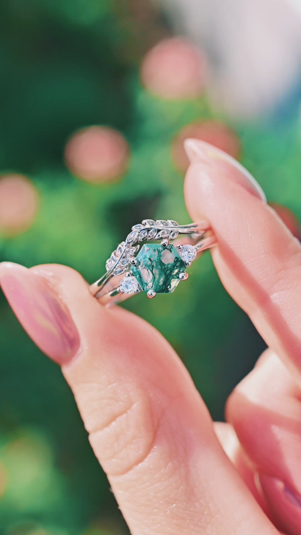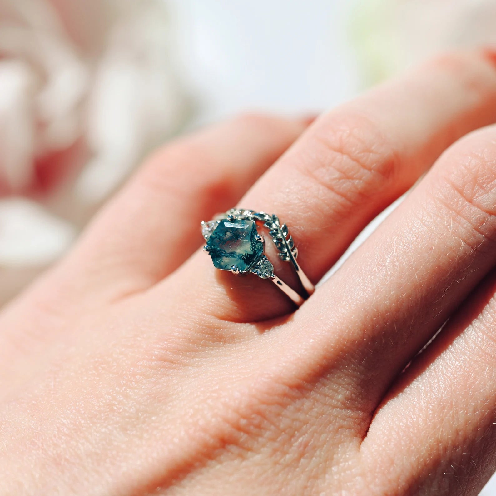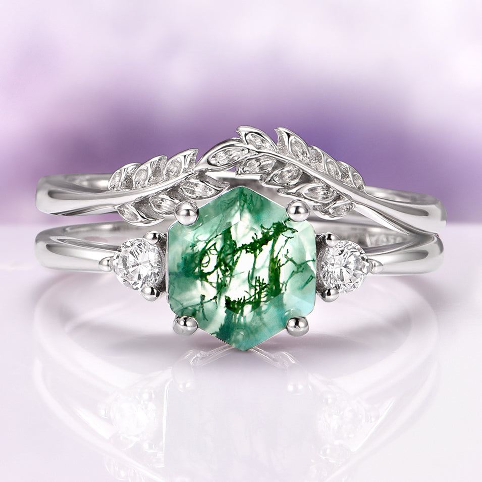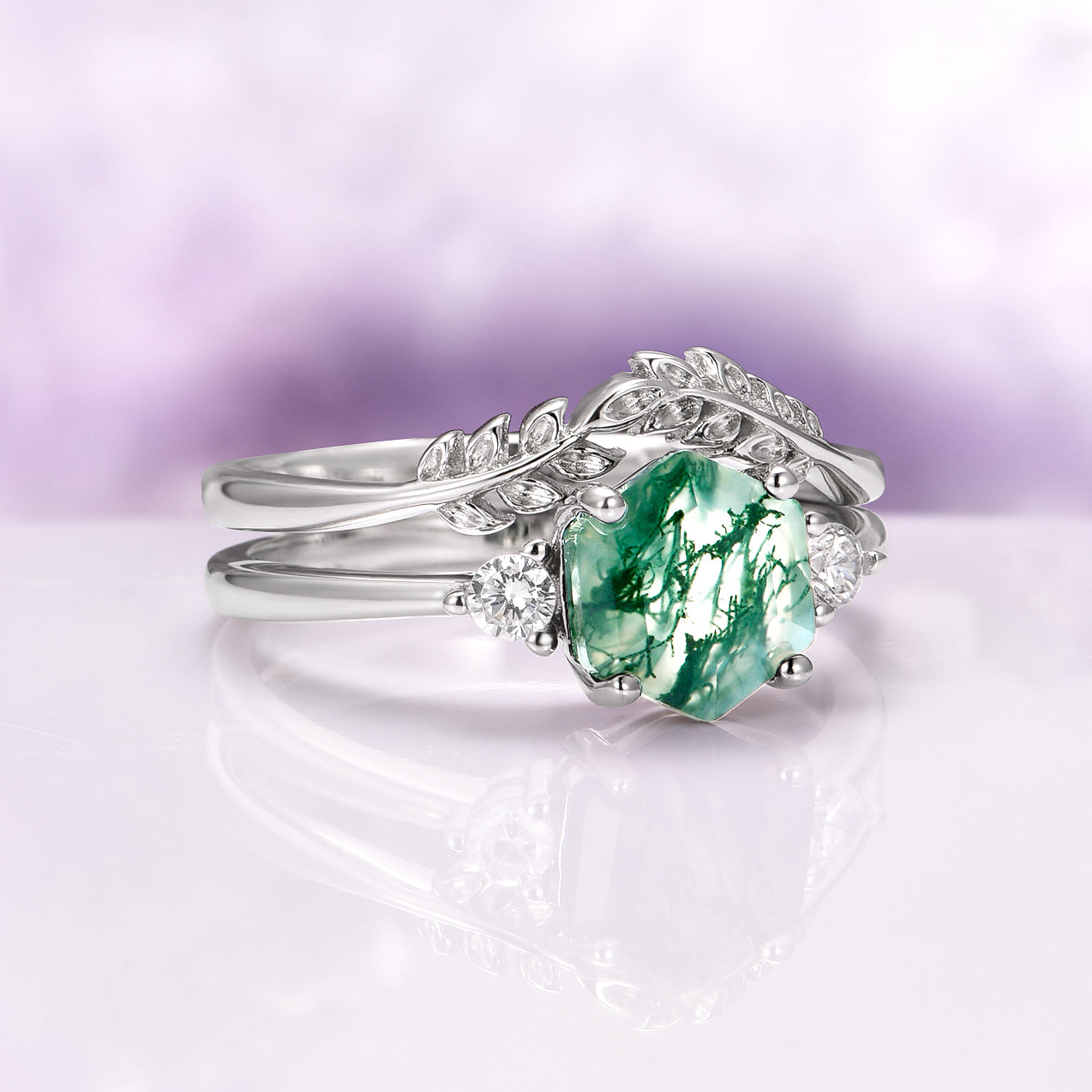 Moss Agate Leaf Ring Set in 925 Sterling Silver – Nature Inspired Hexagon Engagement Ring – Unique Promise Ring – Anniversary Gift for Her