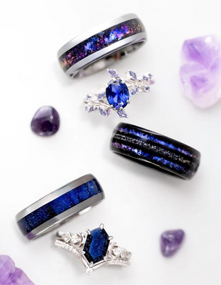 Embrace the beauty of the cosmos with the Starry Night & Blue Sandstone Engagement Ring Set. Crafted from 14k white gold, this captivating ring set showcases a mesmerizing blue sandstone at its center, evoking the enchanting allure of a starlit sky. Accentuated by sparkling sapphire stones and intricate moon and star details along the band, this celestial design symbolizes serenity, wisdom, and the magic of the universe.